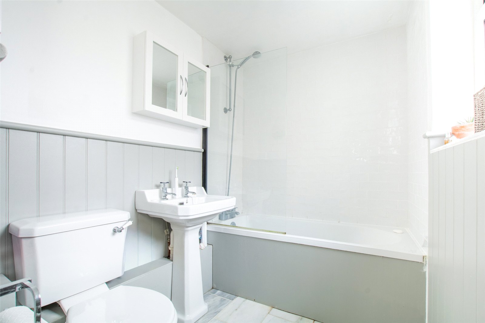 To the rear, a practical inner lobby provides access to the garden and houses the boiler and plumbing for laundry appliances. The ground-floor bathroom is well-appointed with a modern suite, shower over bath, heated towel rail, and tasteful tiling, offering a comfortable and functional space.