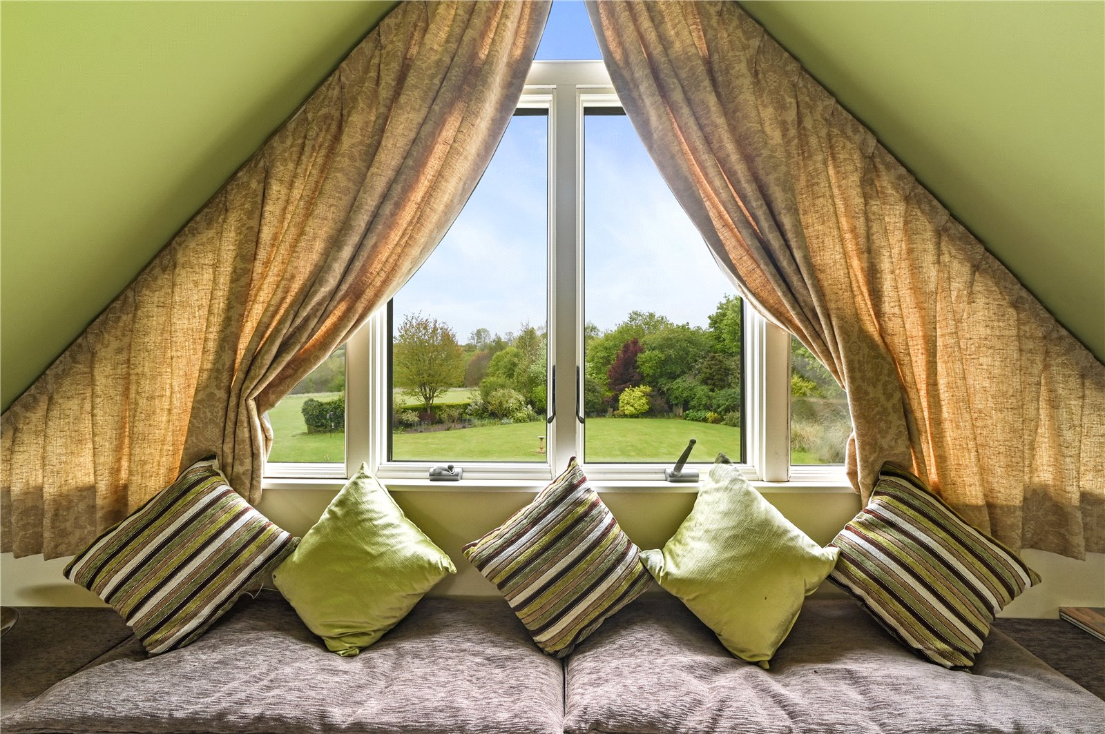 Adjacent to the dining room is a modern, sleek kitchen equipped with Neff appliances – replete with wine fridge - and a central island. This kitchen is not just a culinary workspace but a vibrant heart of the home, where functionality meets style in a seamless blend. The space opens out to a serene garden room, providing a perfect spot for morning coffees or evening relaxation, overlooking the sprawling gardens.