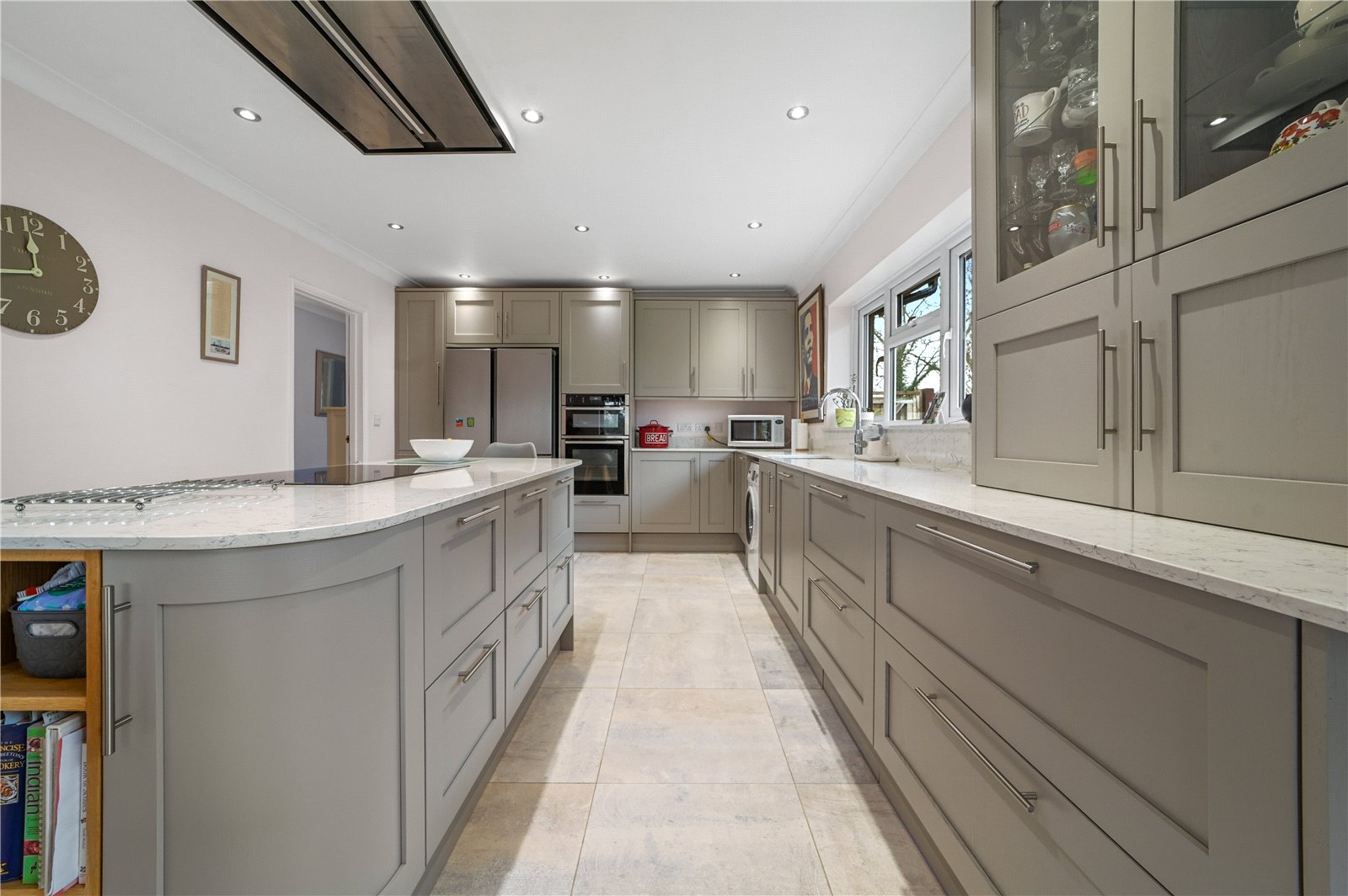 At the heart of the home lies the kitchen / dining room, an impressive and sociable space designed for modern family life. Fitted with an extensive range of contemporary cabinetry and complemented by stone work surfaces, the kitchen centres around a substantial island that provides both additional preparation space and informal seating.
