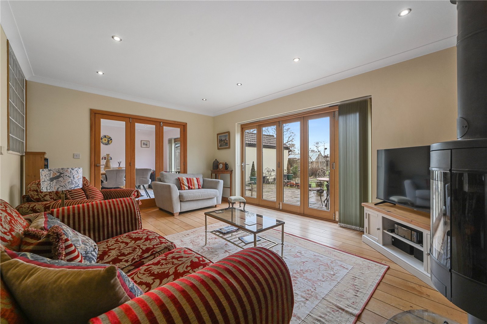 The dining area sits alongside, with further glazed doors opening onto the garden terrace, making this a natural hub for everyday living as well as larger gatherings.