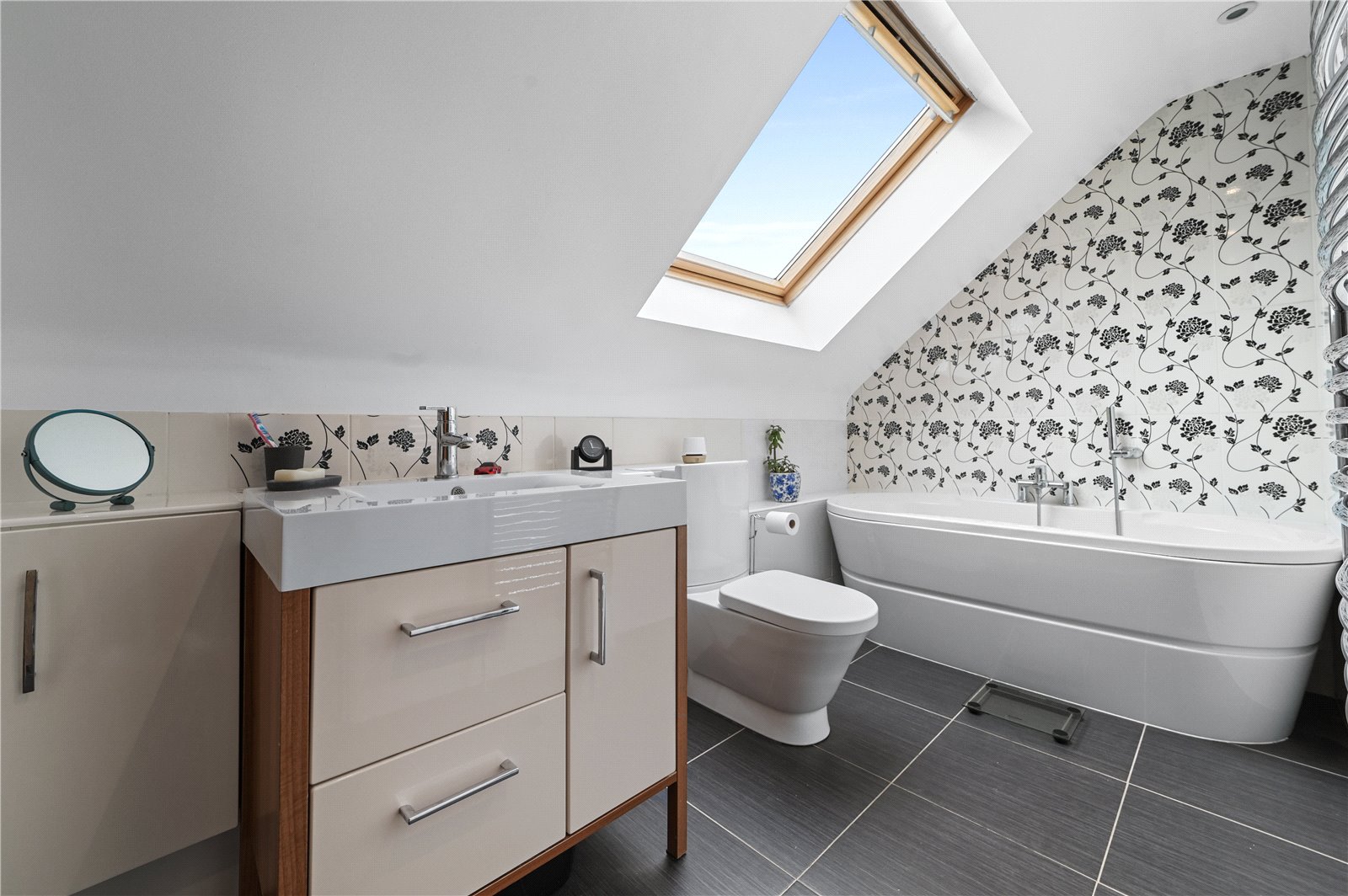 Upstairs, a spacious landing leads to the principal bedroom, where double doors open to a Juliet balcony with attractive views across the rear garden. A further double bedroom and a stylish bathroom with a skylight complete the first floor, creating a practical and versatile layout for both family living and guests.