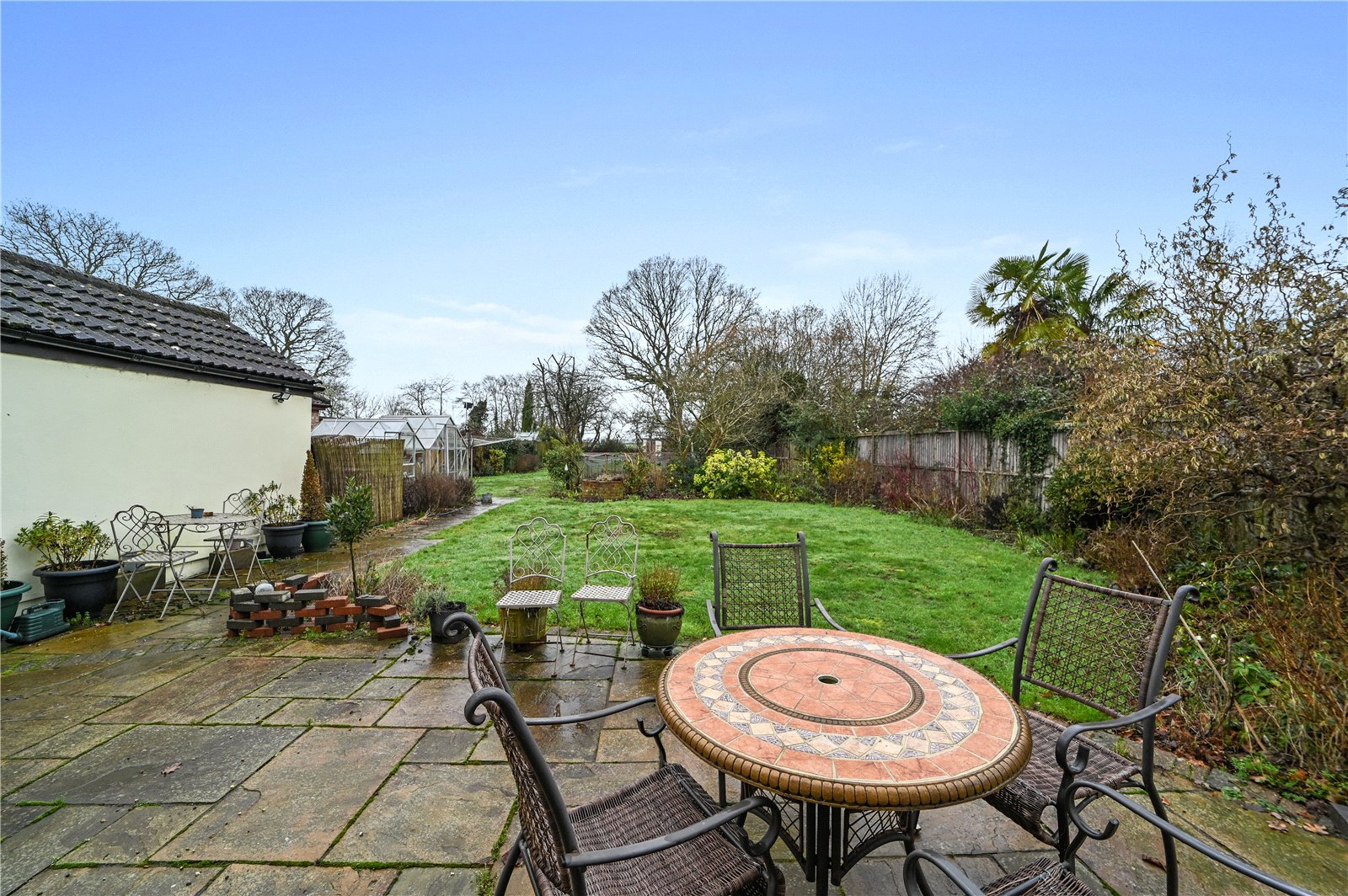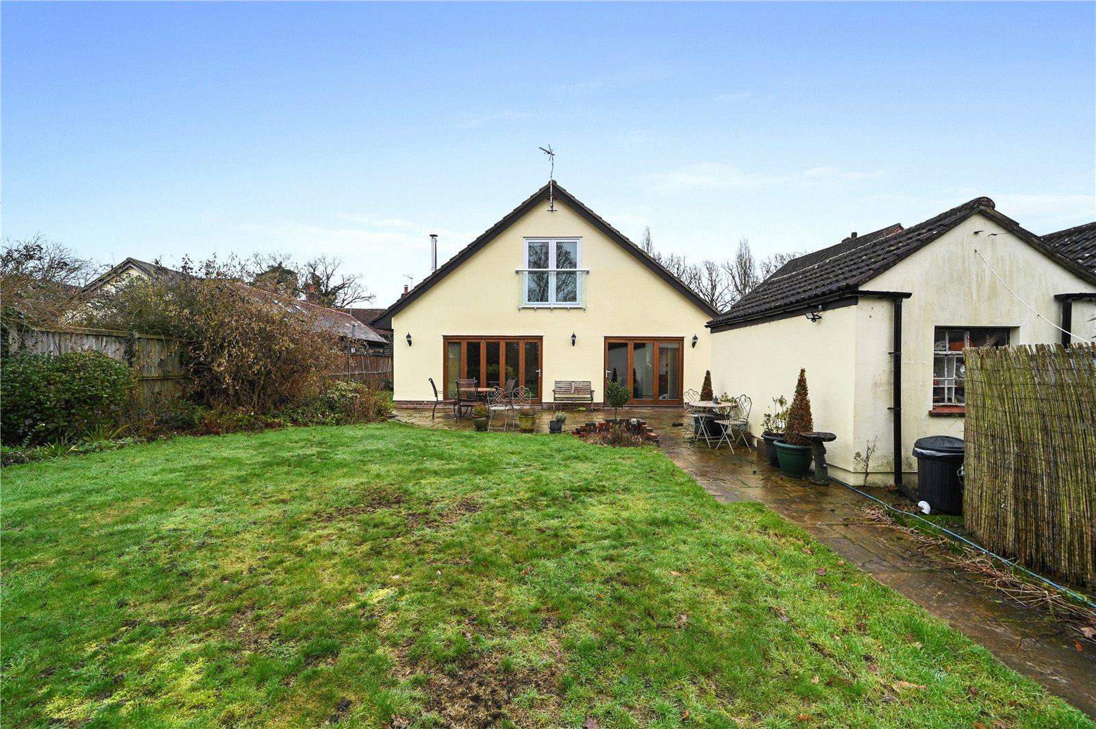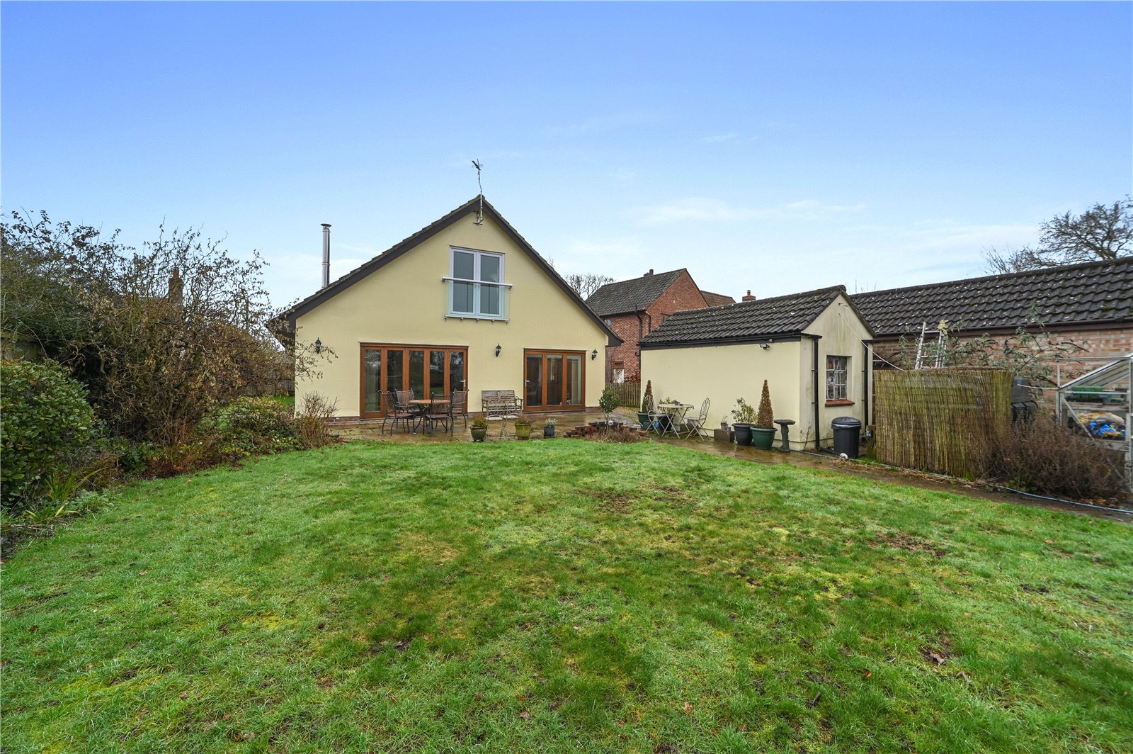 Externally, the property enjoys a generous plot with a substantial rear garden that backs directly onto open countryside, creating a wonderful sense of space. A paved terrace adjoins the house, providing an ideal spot for outdoor dining and entertaining, while the remainder is laid mainly to lawn with established trees, shrubs and planted borders adding colour and structure throughout the seasons.
