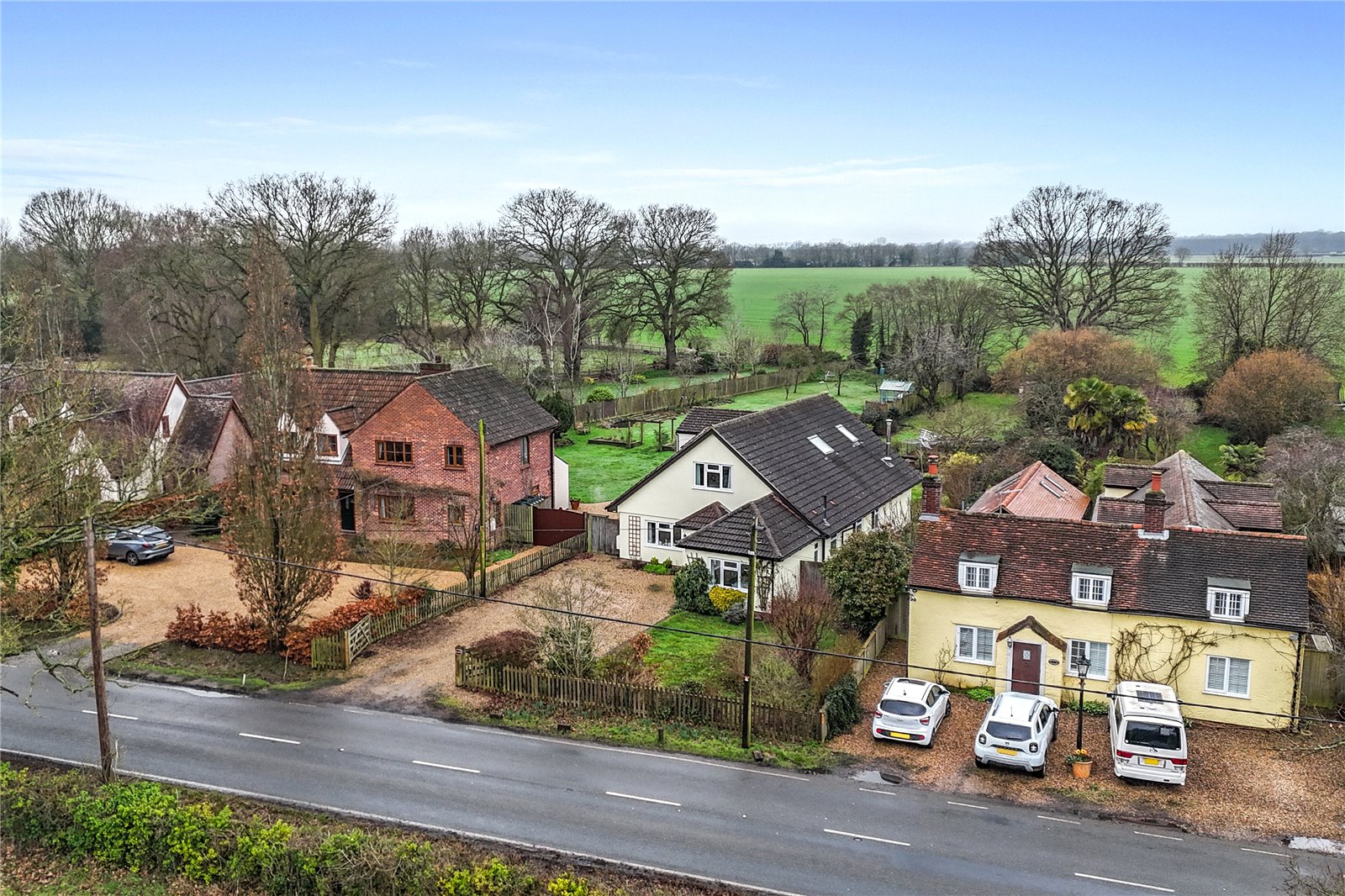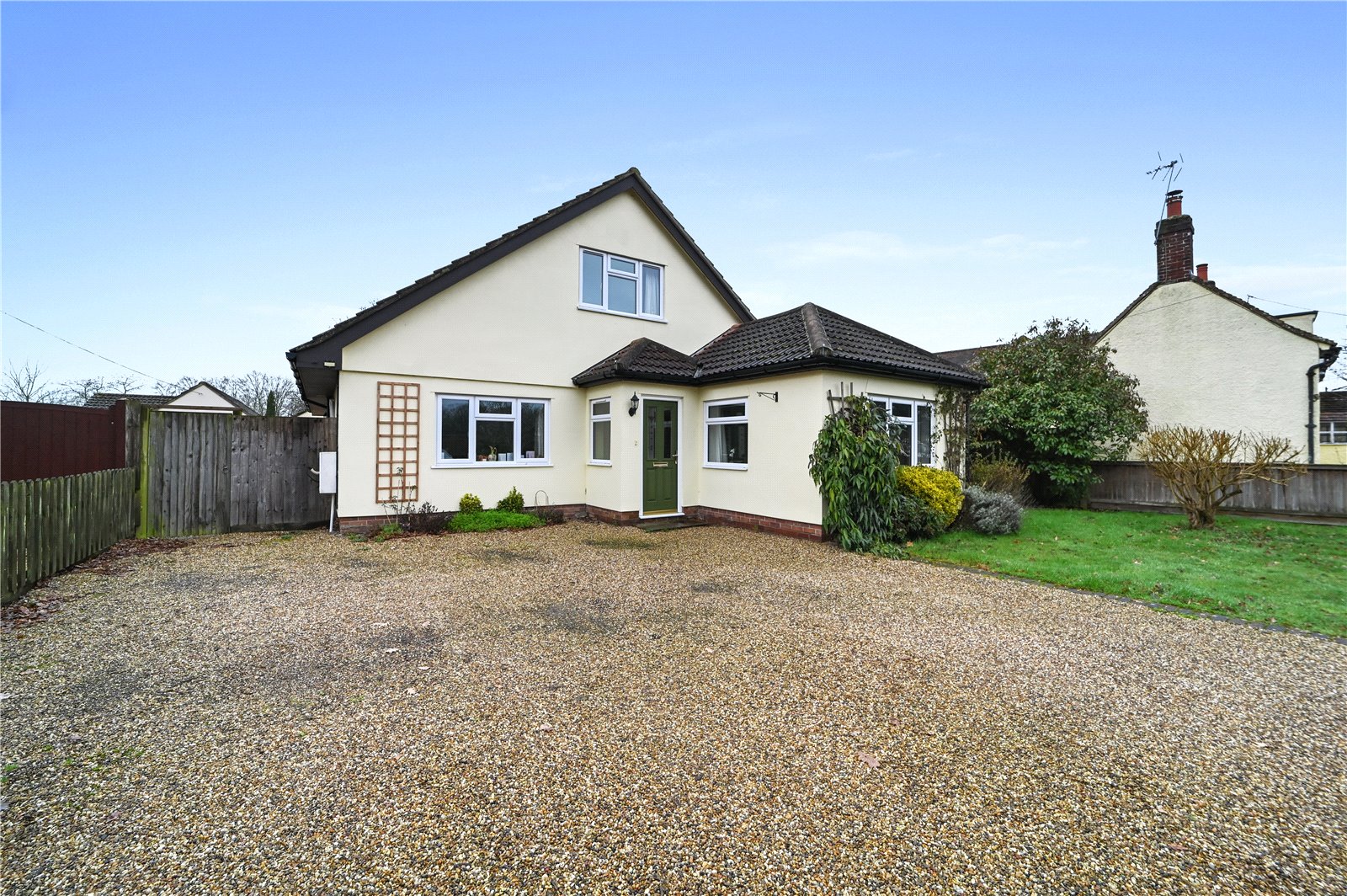 The property is approached via a wide, gravel driveway which provides ample off-road parking and leads to the entrance door.