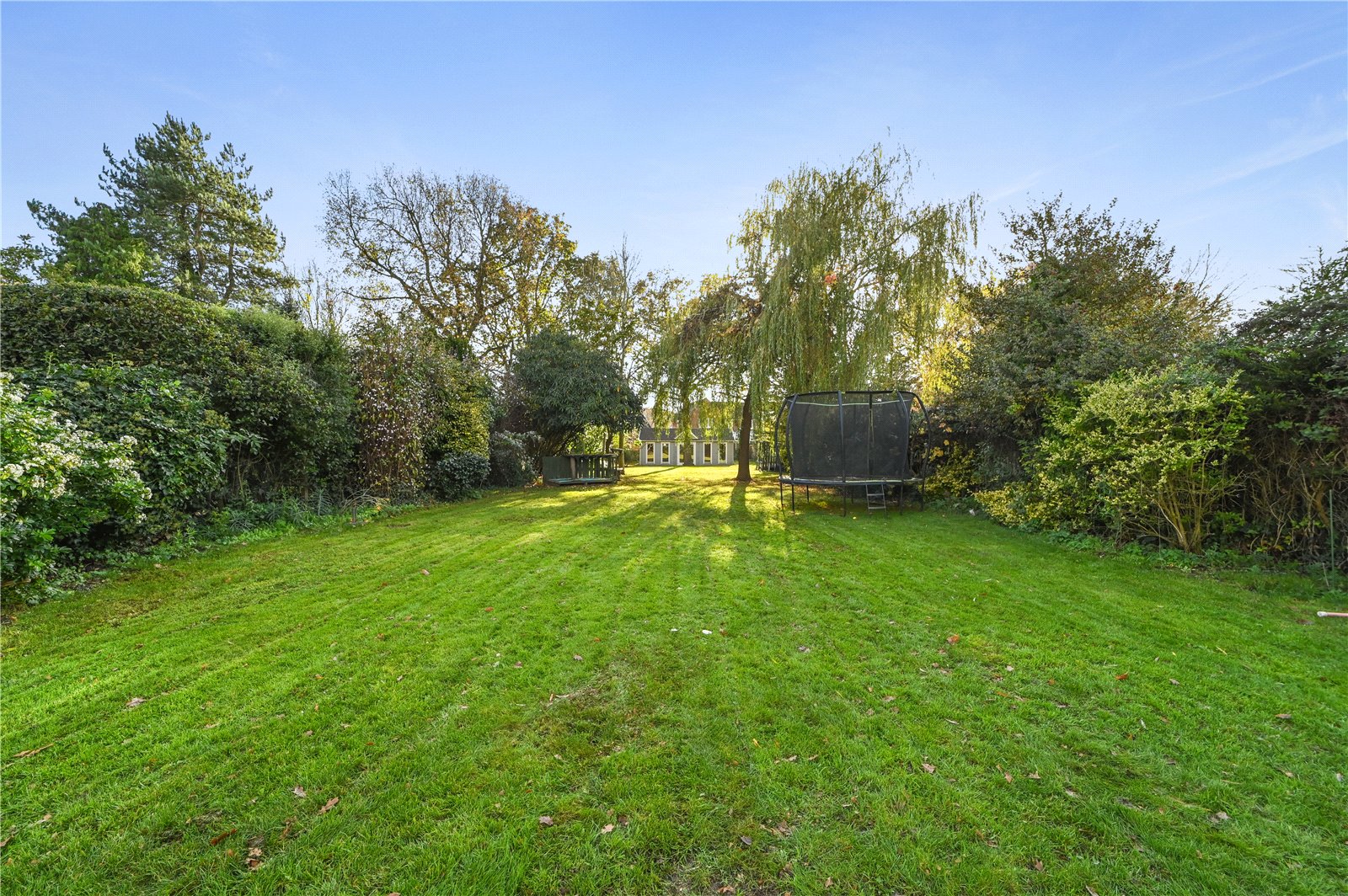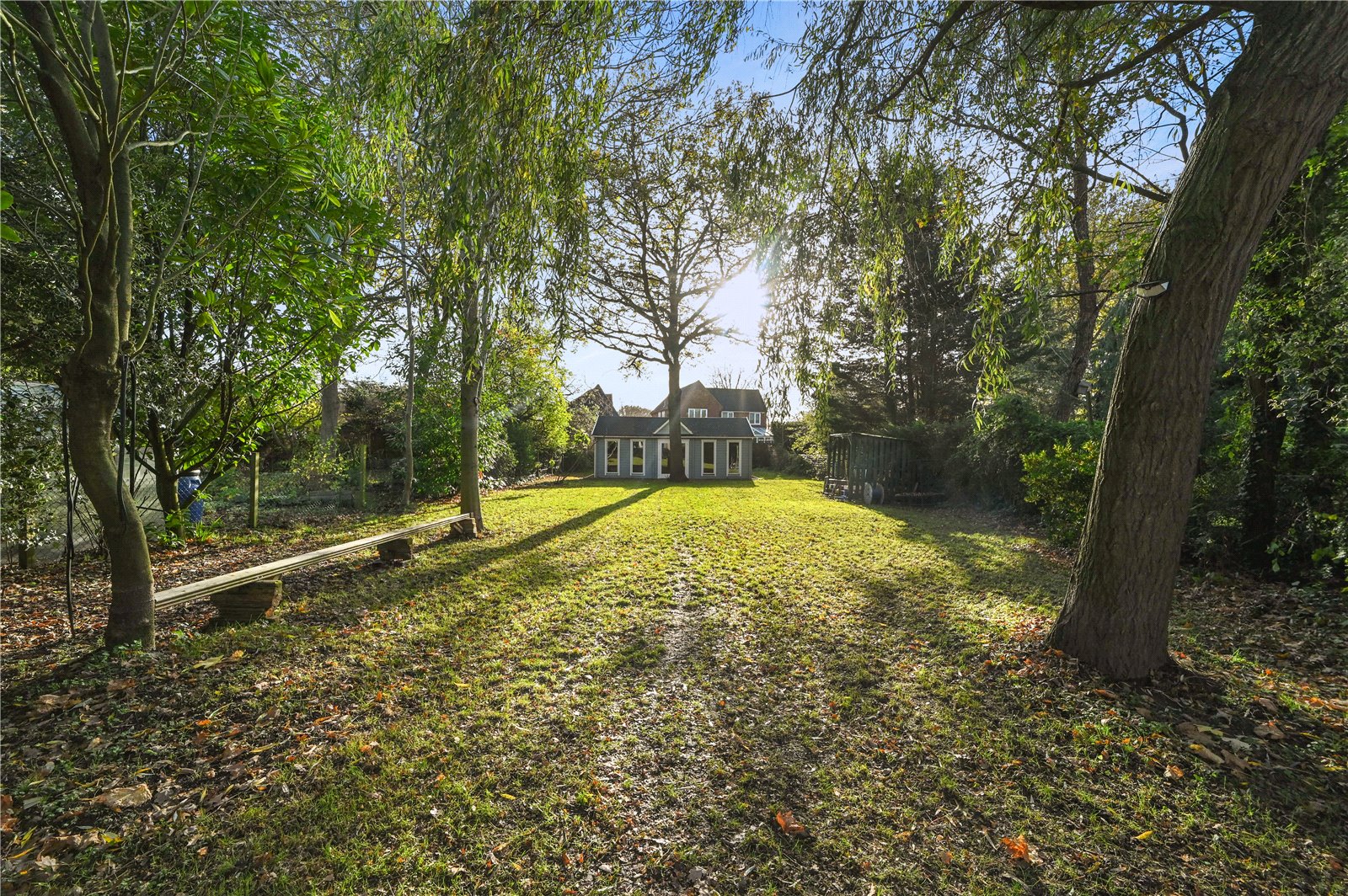 A gravelled driveway provides ample parking and leads to a double garage. To the rear, the garden stretches out across an impressive lawn bordered by mature trees and established planting, offering an inviting setting for outdoor enjoyment.