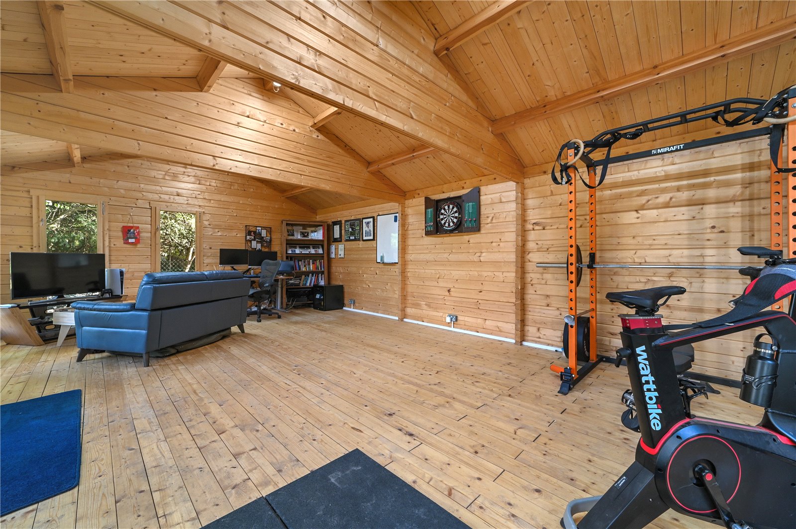 A paved terrace sits directly behind the house for easy outdoor dining, while a large, detached outbuilding provides a versatile space suited to use as an office, studio, or games room.