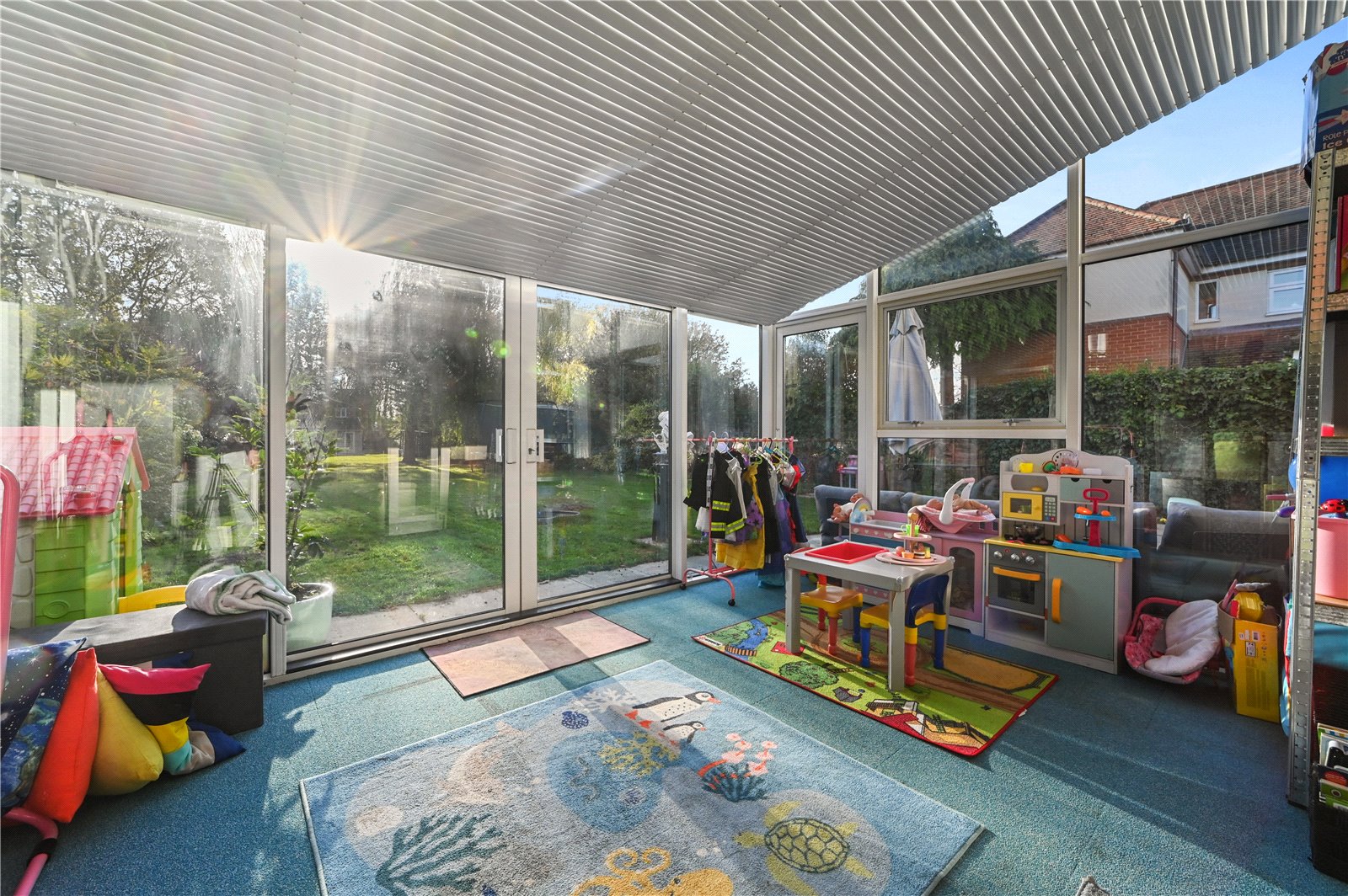 The dining room sits close to the kitchen and enjoys a pleasant outlook over the rear garden. The main living room is a comfortable and spacious area, filled with natural light from wide doors opening into the conservatory. This additional reception space offers a versatile environment with full-height glazing that connects the interior to the garden throughout the year.