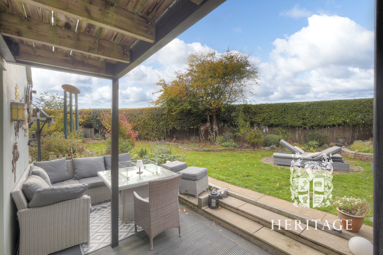 The rear garden is attractively landscaped, featuring an extensive patio that wraps around to a hot tub area (available by separate negotiation). A mature beech hedge provides privacy and separates the garden from the adjoining field, with a gate giving access. The garden also has a wood store and pond with a waterfall.