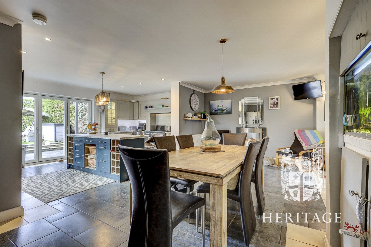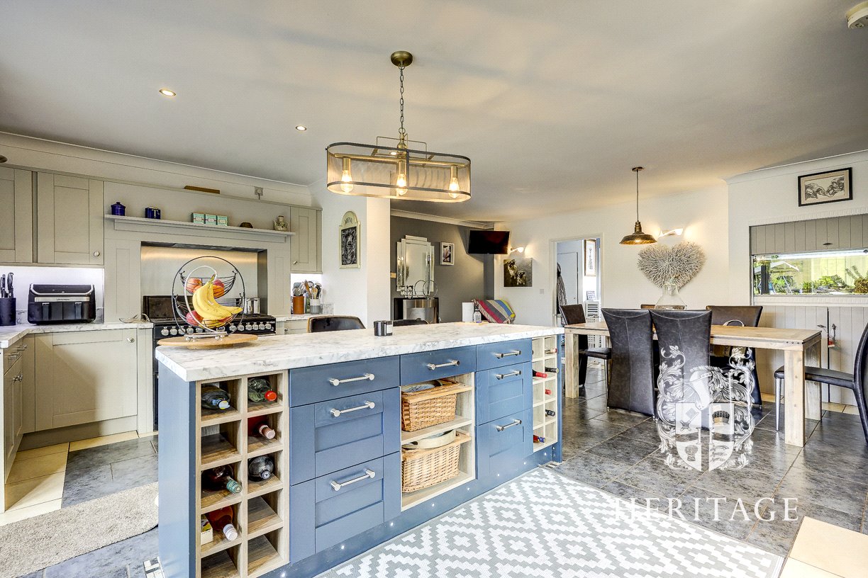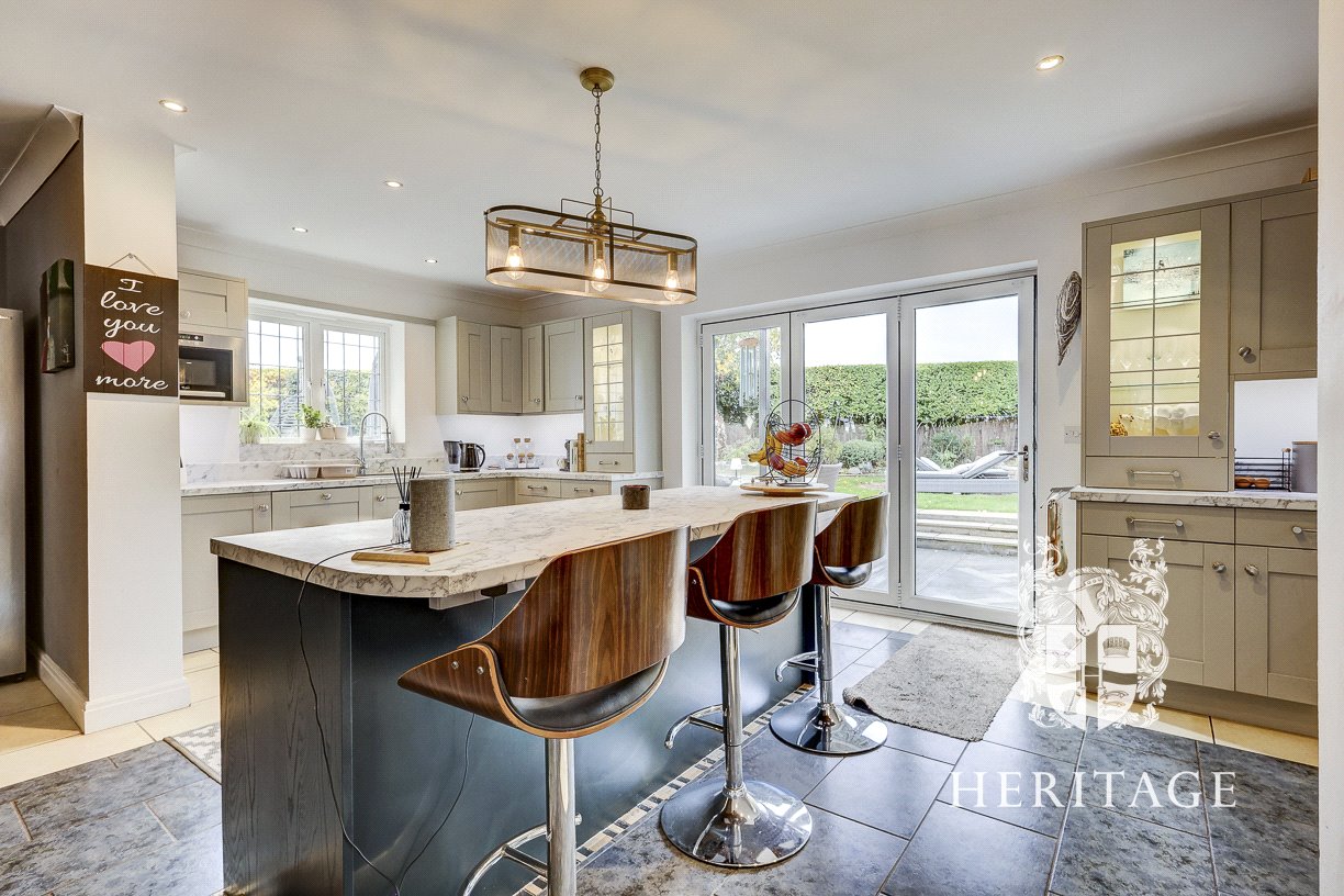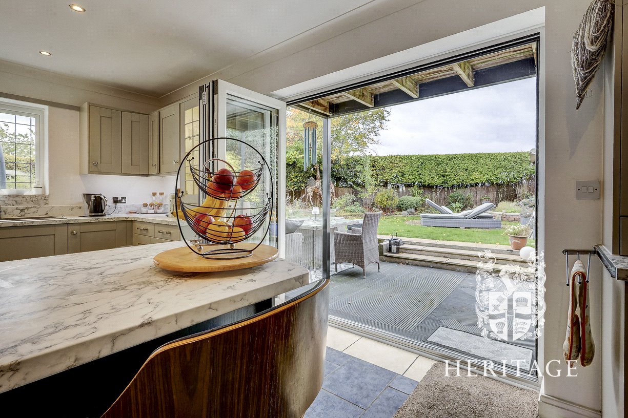 The most notable space is the impressive kitchen/dining room, extending to around 46 sq. metres. It opens via bi-fold doors to the rear garden and features a comprehensive range of storage options, including a large central island – which, among other things, offers space for up to 20 bottles of wine! There is also a built in fish tank between the kitchen and office.