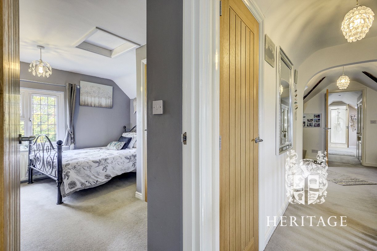 Upstairs, there are three double bedrooms, two of which have en-suites a large landing area which could be utilised as a dressing area or nursery area. The principal bedroom enjoys a walk-through wardrobe and dressing area, as well as a balcony with stunning westerly views across open countryside.