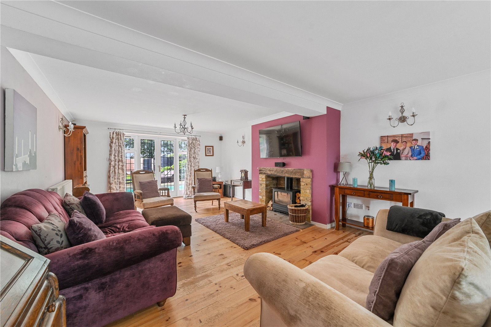 Once inside, the entrance hall flows seamlessly into the dual aspect living room, which benefits from natural light streaming into the room. Double doors, flanked by full height windows offer views over the garden whilst an inset wood burner creates additional warmth and ambience during the cooler months.