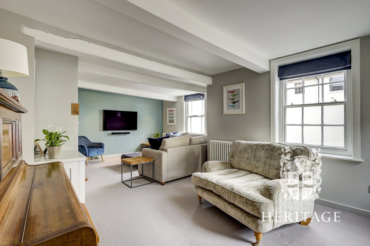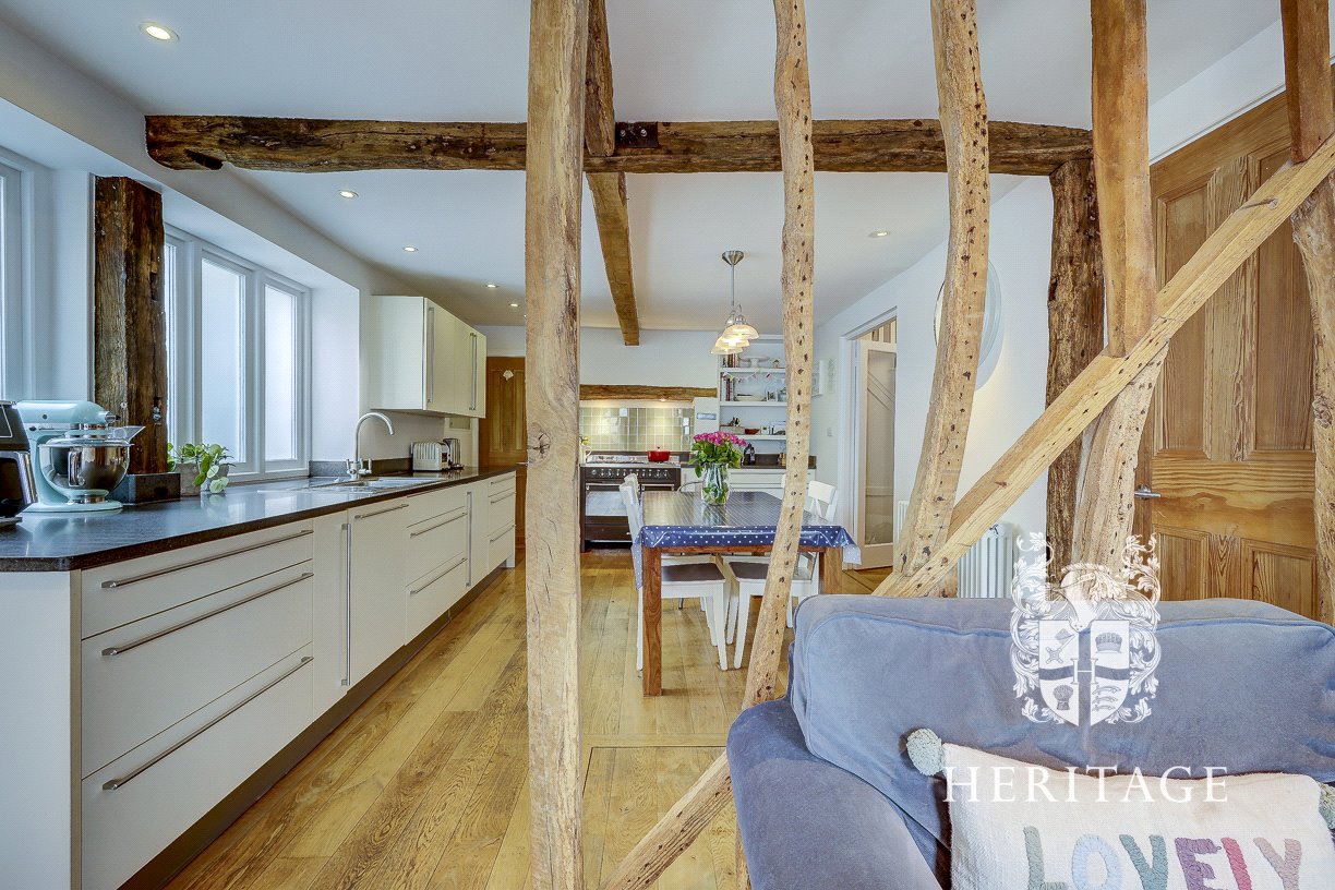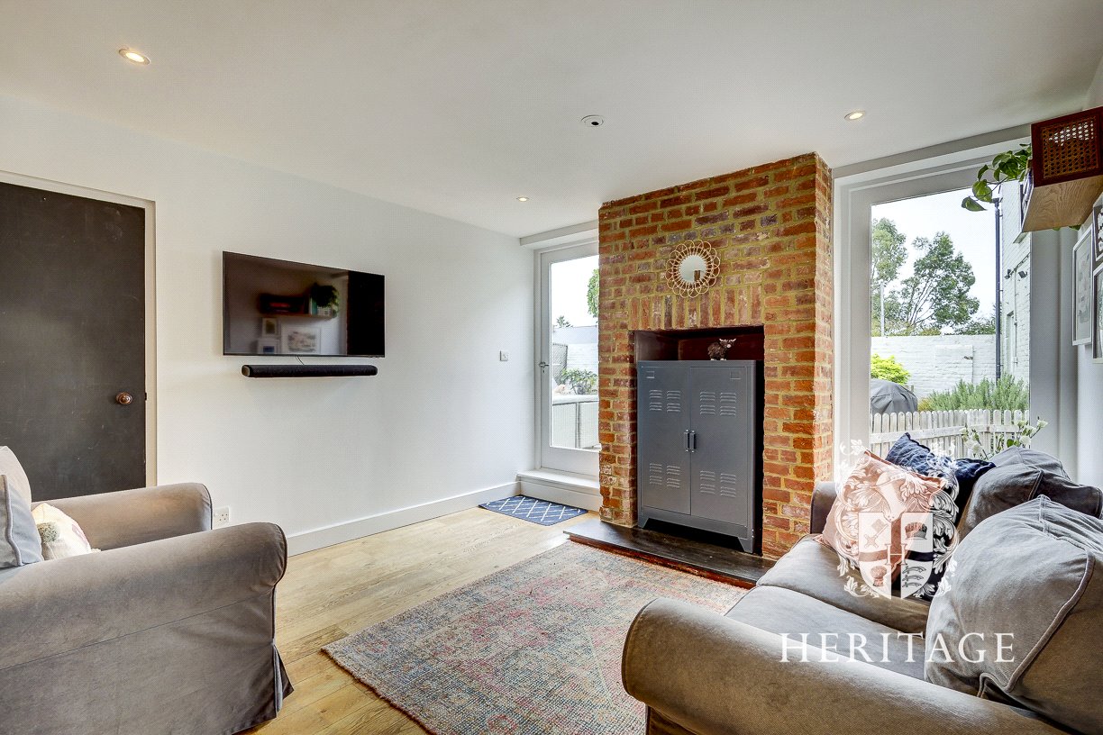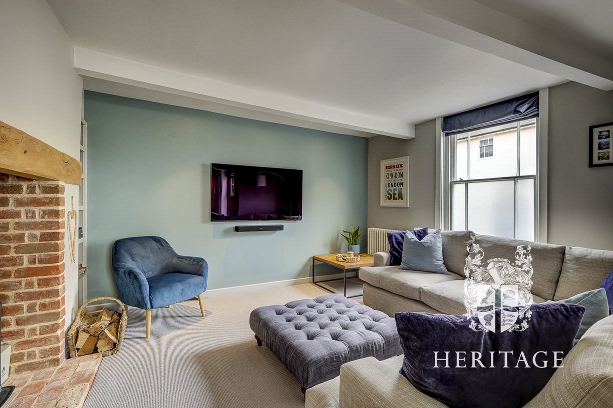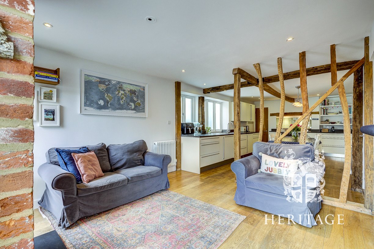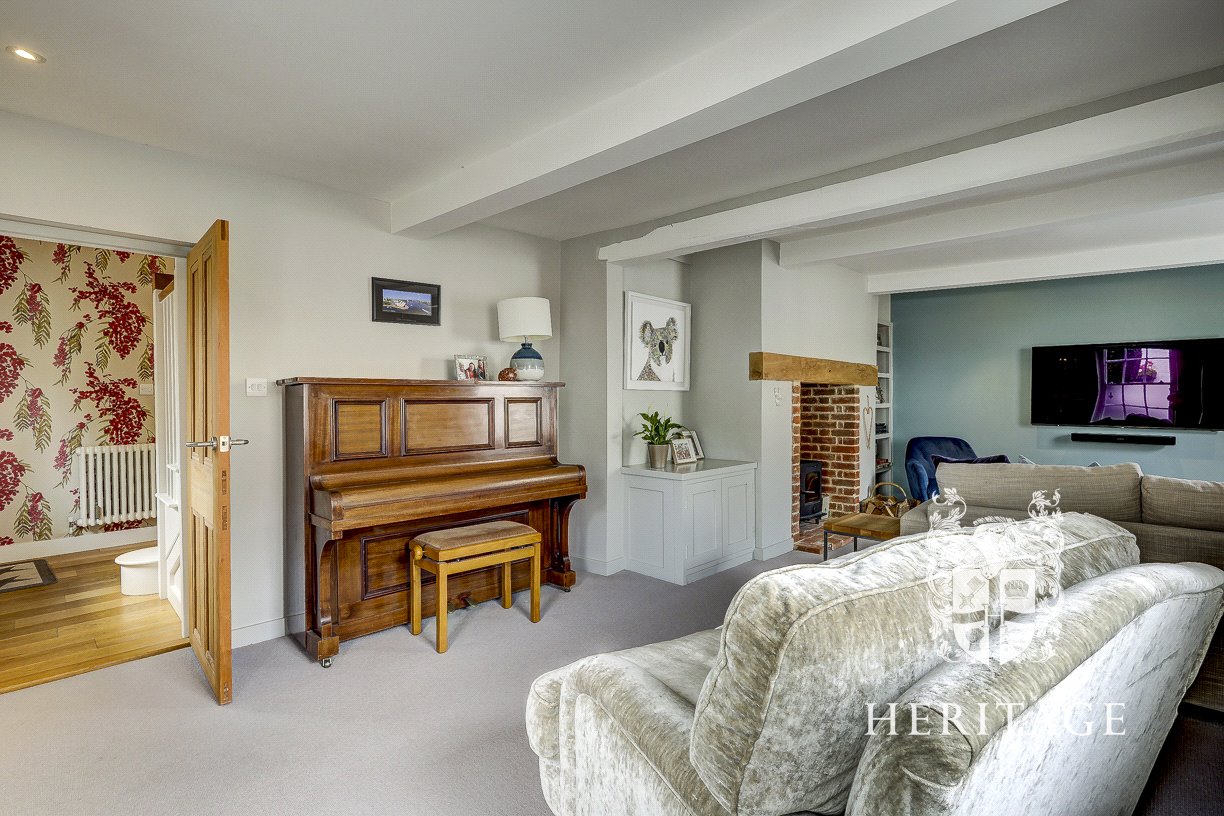 - Bright sitting room with wood burner, exposed brick hearth and oak bressumer