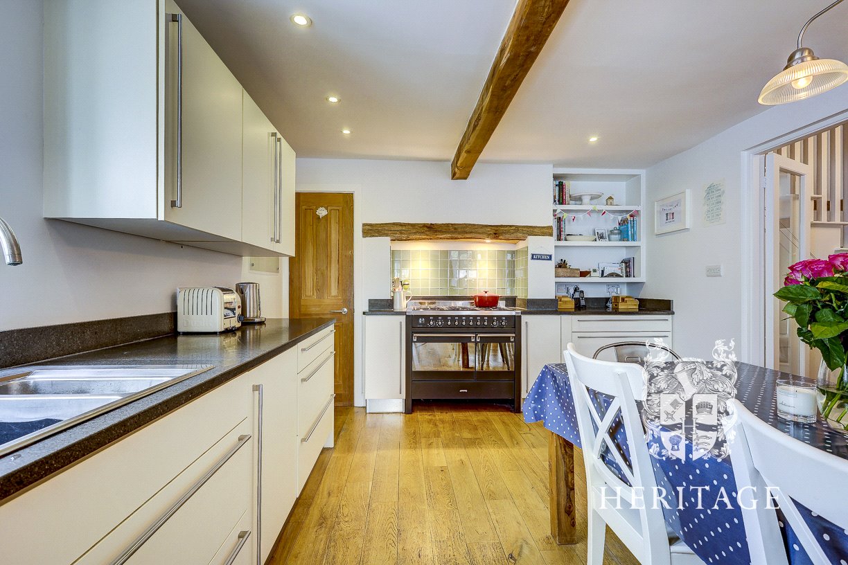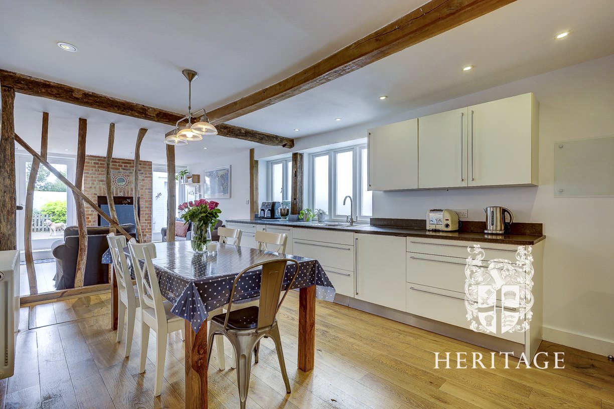 - Spacious kitchen/dining room with seating area and feature brick chimney