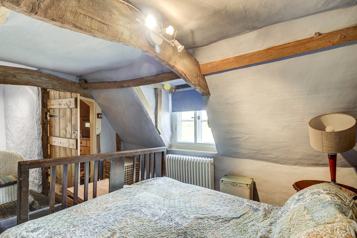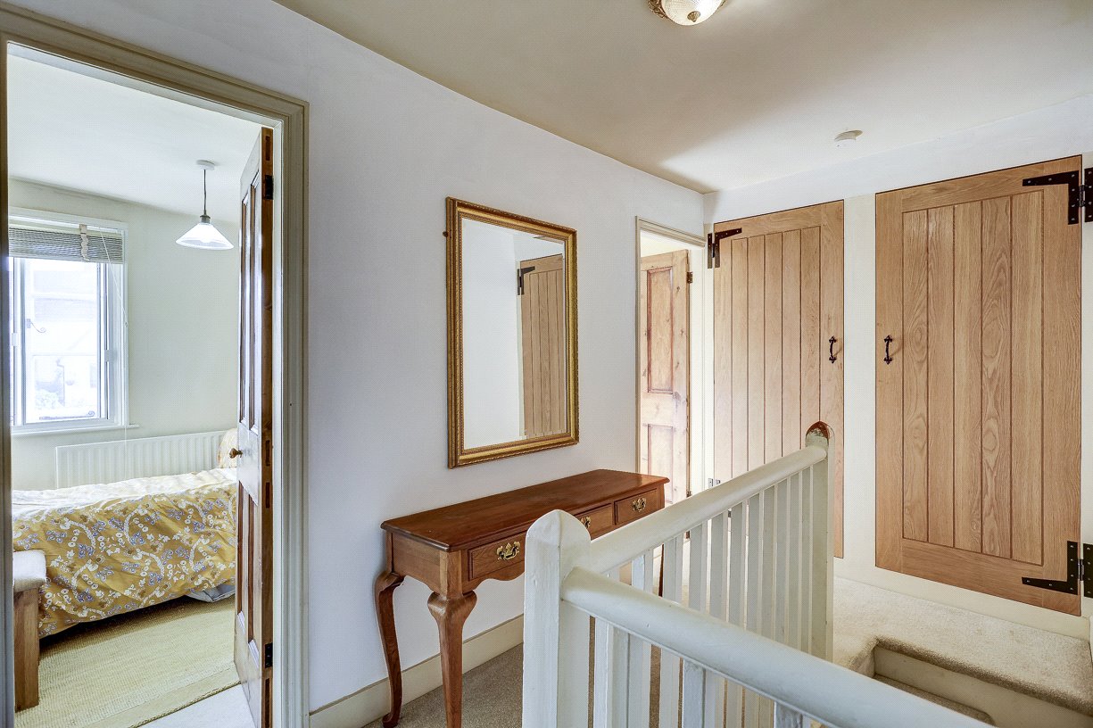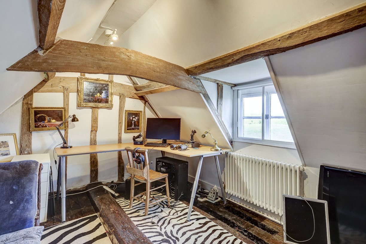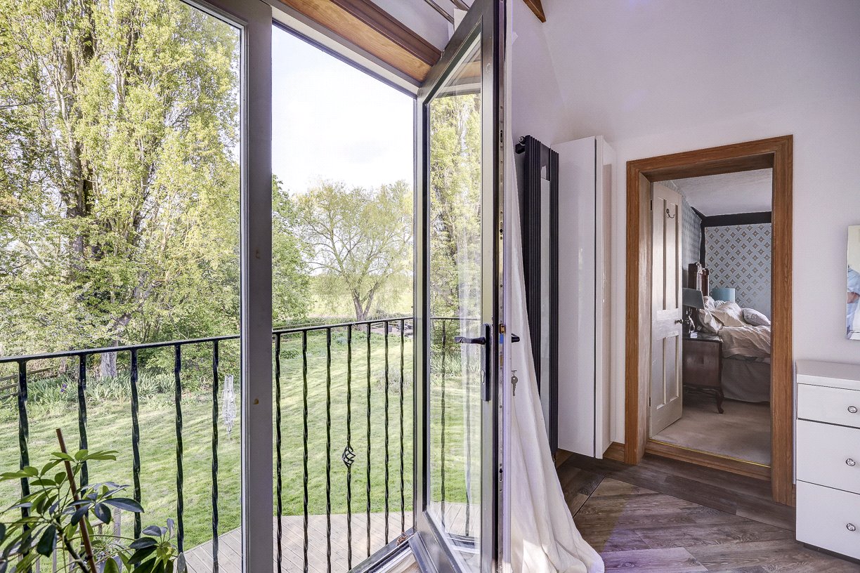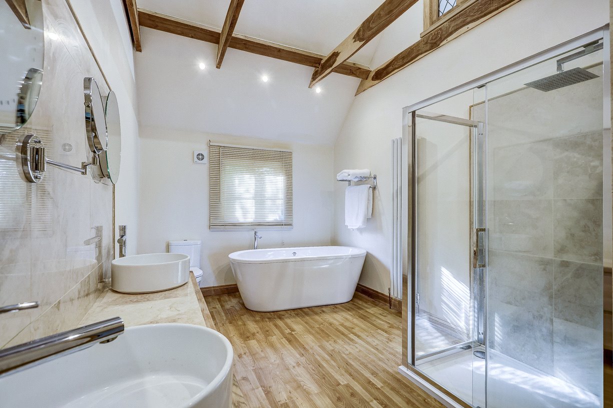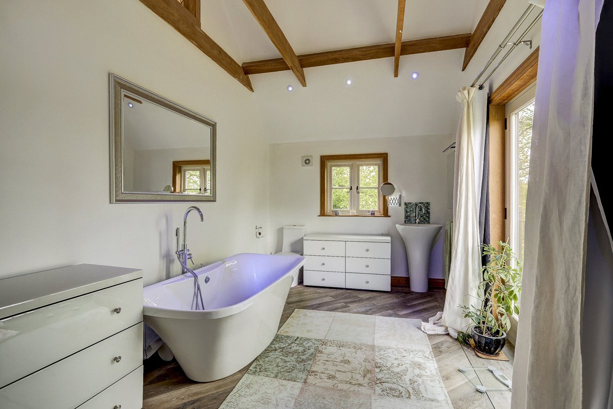 Upstairs, there are four bedrooms—two doubles and two singles—and a stunning bathroom with vaulted ceilings. The principal bedroom has the added luxury of an en-suite bathroom, a large and indulgent space with vaulted ceiling, a double-ended bath and views over open countryside via a Juliet balcony.