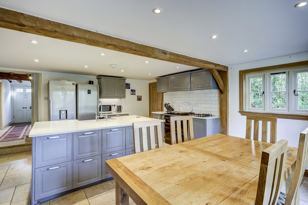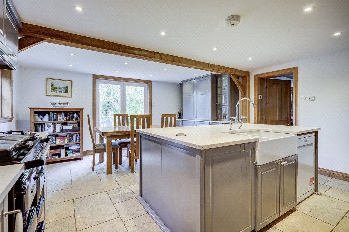 The kitchen/dining room is the heart of the home. Forming part of the newer extension, this light-filled space features double doors leading out to a raised decking area that enjoys an Easterly aspect—perfect for morning coffee or alfresco brunches. The kitchen also connects to a practical boot room, utility area and cloakroom, with additional access to the side of the property.