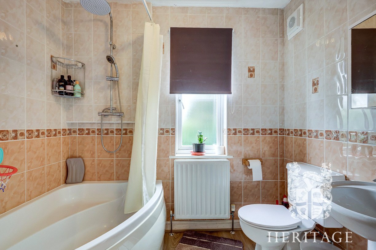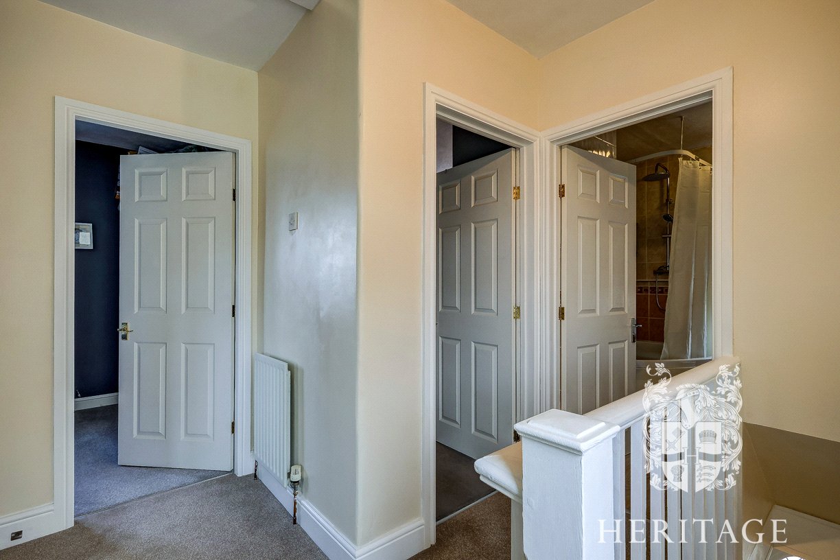 The first-floor landing provides access to four bedrooms and the family bathroom. The principal bedroom is located at the rear of the property and benefits from a dressing room and a private en-suite, creating a comfortable main bedroom suite. Bedroom two is another generous double bedroom with ample space for freestanding wardrobes. Bedroom three accommodates a double bed comfortably, while bedroom four works well as a single bedroom, nursery, or additional home office. The family bathroom is fitted with a corner bath with shower over, serving the remaining bedrooms.