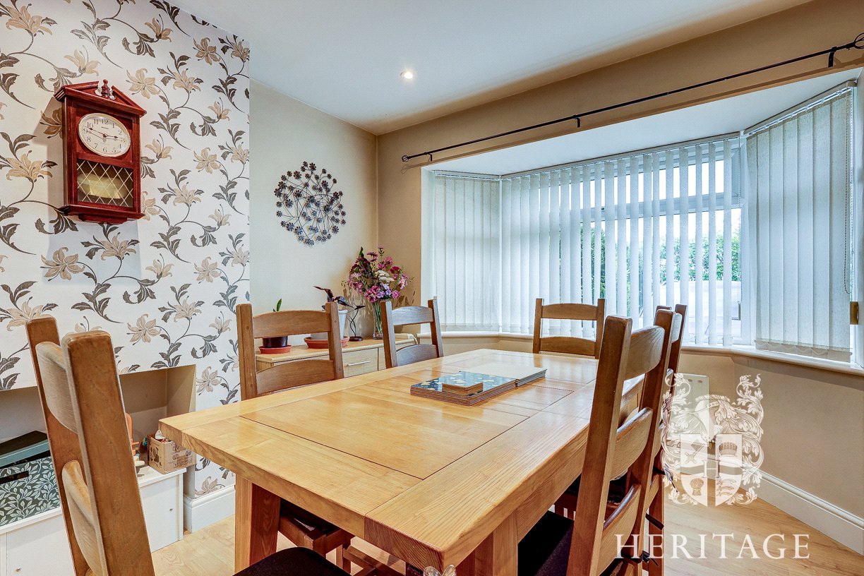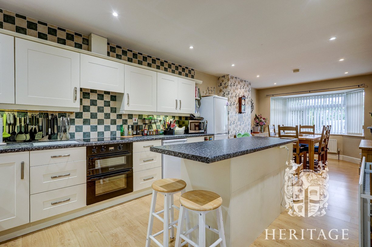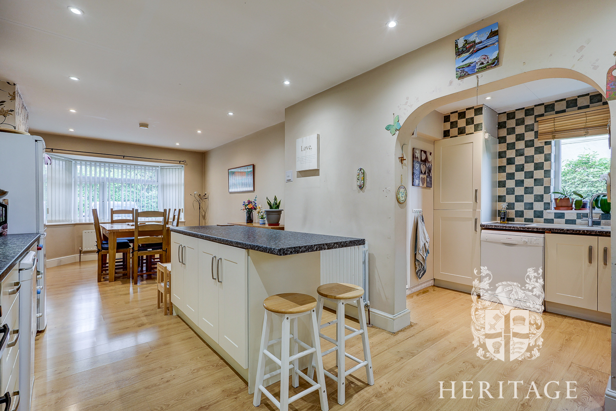 Upon entering the property, you are welcomed into a central entrance hall with stairs rising to the first-floor accommodation. The principal living space is the impressive kitchen/diner, which features an extensive range of fitted units complemented by a central island breakfast bar, creating a practical and sociable hub of the home. The dining area benefits from a charming bay window overlooking the front of the property, offering ample space for family meals and entertaining guests.