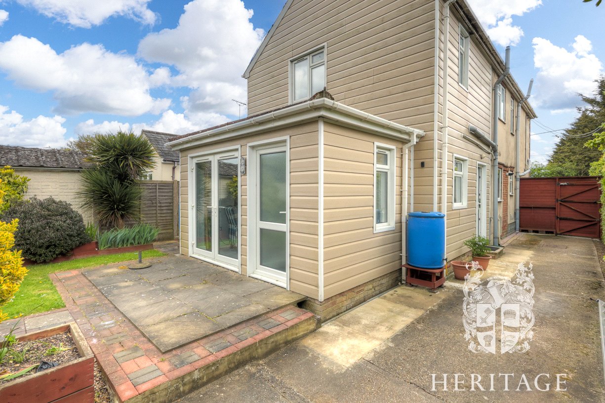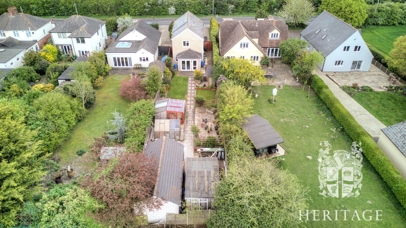 Externally, the property is set back from Coggeshall Road, offering ample off-road parking to the front. A wide side access leads through to the rear garden, which is ideally suited for families and entertaining. The garden features a patio area directly accessed from the sitting room and office, ideal for outdoor dining, with a lawn extending to the rear. Here, a range of outbuildings can be found, including a brick-built store and a large, separate workshop, offering excellent storage or hobby space.