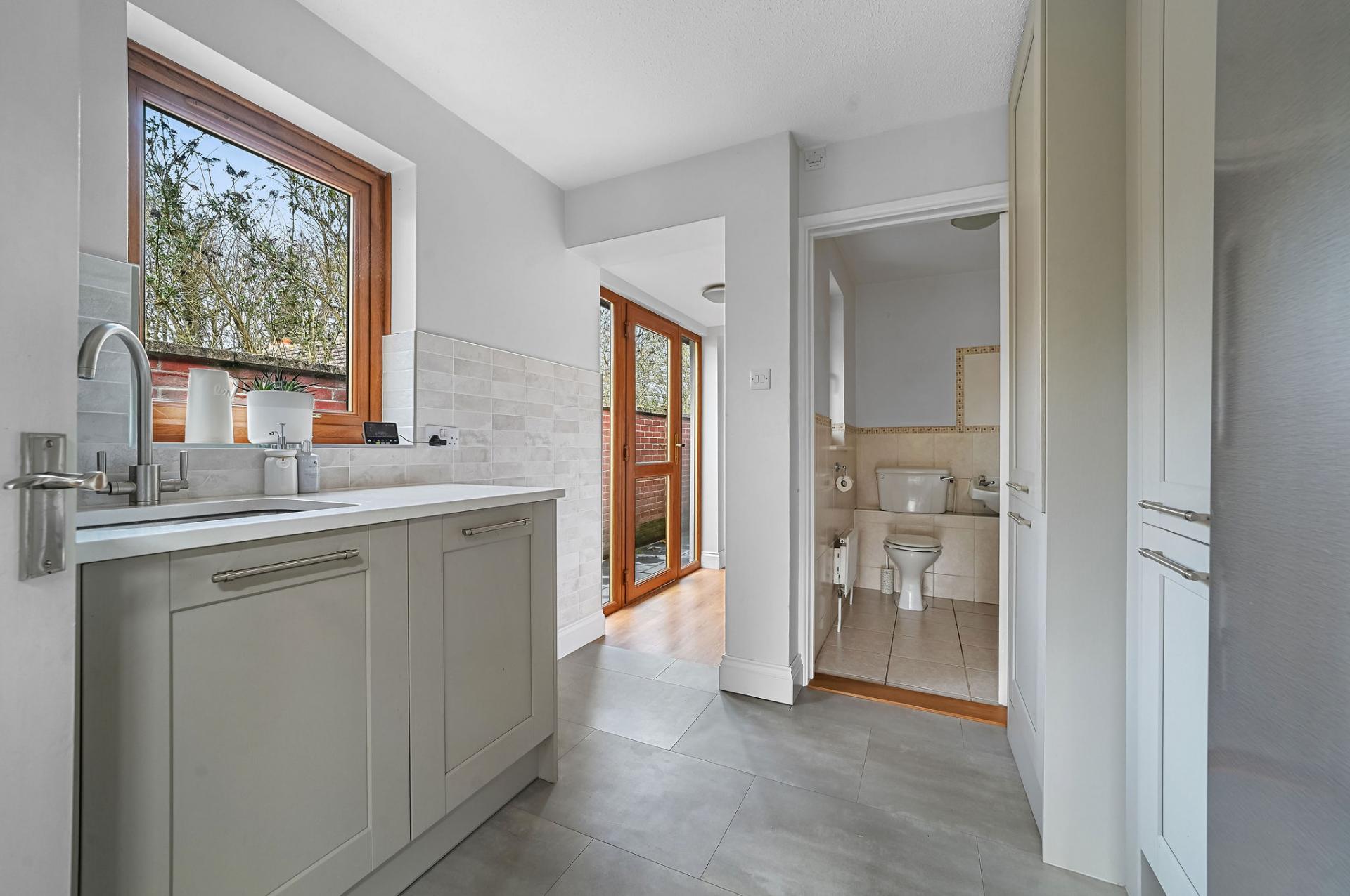 Cloakroom White suite comprising w.c, pedestal hand wash basin, tiled flooring, partly tiled walls and frosted window to hallway and utility room.
