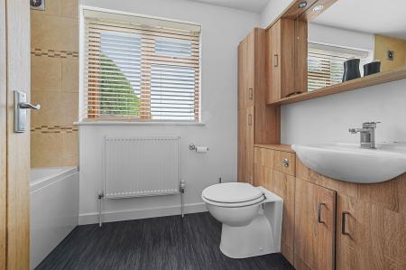 Family Bathroom White suite comprising w.c, hand wash basin with storage under, additional built-in storage, corner bath, generous shower cubicle, heated towel, tiled walls, spotlights, extractor and frosted window to front aspect.