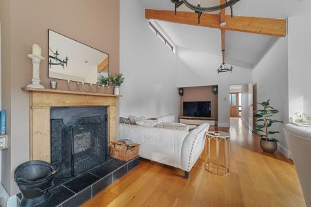 Sitting/Dining Room Approx 27'7 x 14'9 (8.42m x 4.49m) Generous, light and airy space with attractive views of the rear gardens through double doors opening onto the terrace, windows to side aspect, feature inset with wood burning stove on a tiled hearth with wooden mantel surround, hardwood flooring and double doors to: