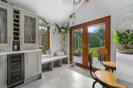 Kitchen/Breakfast Room Approx 17'7 x 8'9 (5.36m x 2.67m) A stylish, well-appointed matching range of wall and base units with Quartz worktops over and inset with one and a half bowl ceramic sink, drainer and chrome mixer tap. Integrated appliances include AEG oven and grill, four ring induction hob with extractor over, dishwasher and wine cooler. The kitchen also incorporates a breakfast bar, built-in sitting area with storage below, French doors to the rear opening onto the terrace, tiled flooring and double aspect windows to the rear and side and door to: