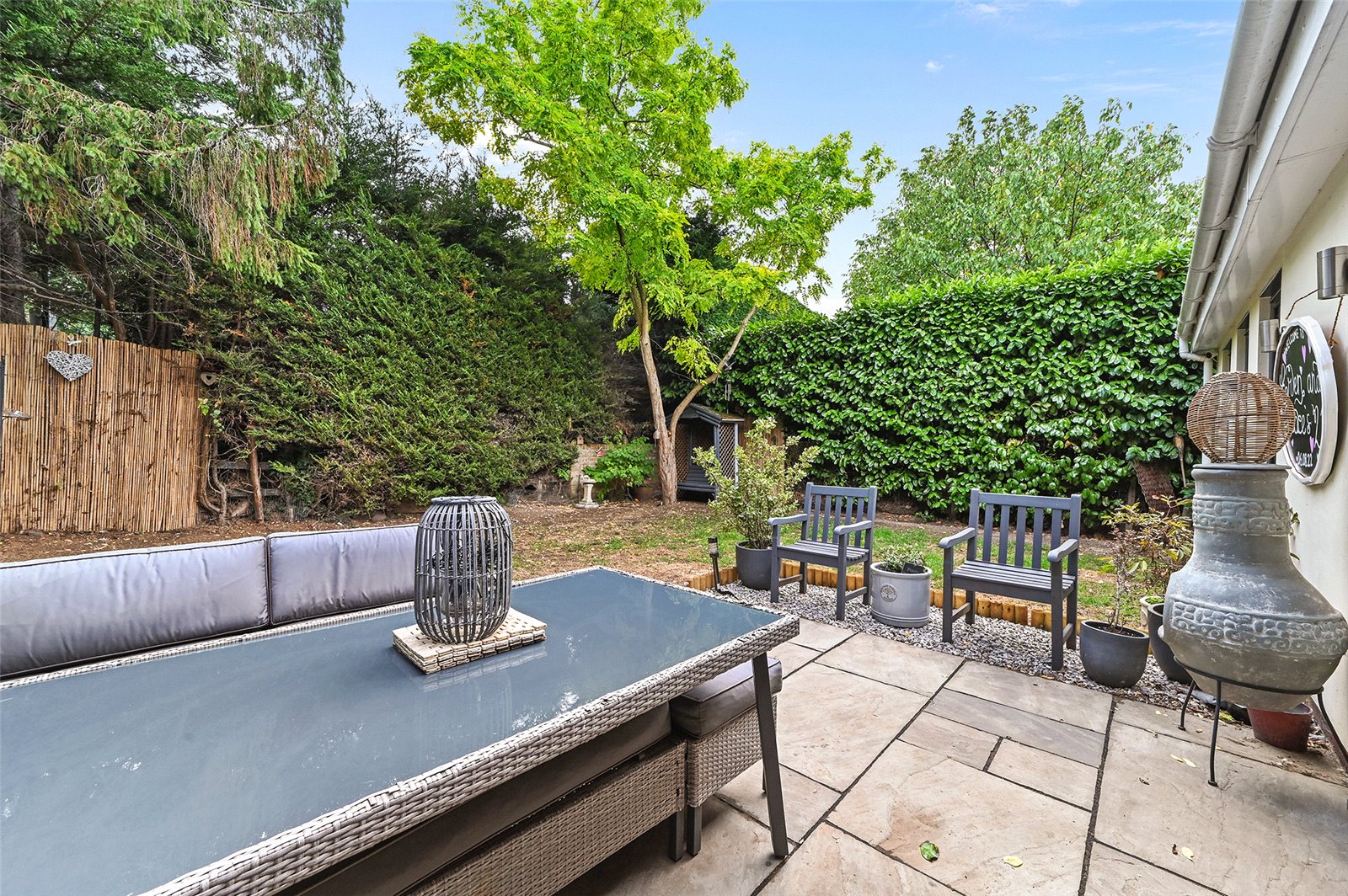 Established boundaries and mature planting help create a sheltered setting, making the garden a natural extension of the living space during the warmer months.