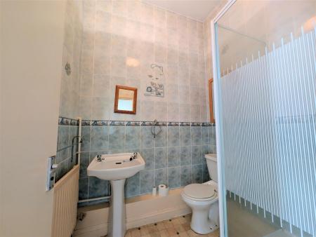 Bathroom - White suite comprising shower cubicle with Neptune Exotic shower attached, tiled walls, pedestal wash hand basin, radiator, close coupled W.C, extractor fan.