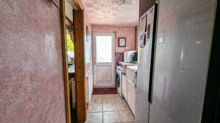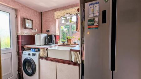 Utility Room - 2.79m x 1.45m (9'02 x 4'09) - Tiled flooring, radiator, base mounted unit with ceramic Belfast sink and mixer tap above, space and plumbing for washing machine, space for American style fridge freezer, part tiled walls, power points, side aspect double glazed UPVC window, rear aspect double glazed UPVC part frosted door into rear garden, a thumb latch door gives access into: