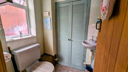 Cloakroom - 1.45m x 1.22m (4'09 x 4'0) - Tiled flooring, W.C, wall mounted wash hand basin with tiled splashback, double door into storage cupboard, side aspect double glazed UPVC window, radiator.