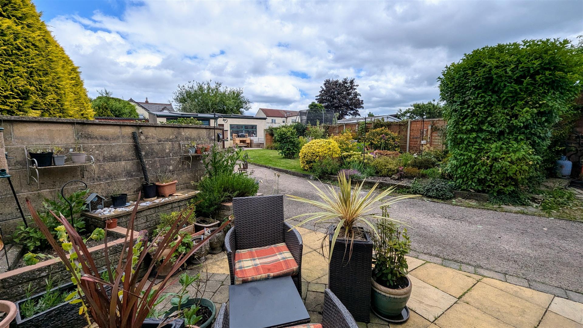 Along the side of the property wooden gates give vehicular access to the driveway offering off road parking for multiple vehicles. The rear garden comprises of a patio seating area accessed via the kitchen and utility, a laid to lawn area, mature shrub and floral borders, all enclosed by fencing. The driveway leads up to a double garage and workshop.