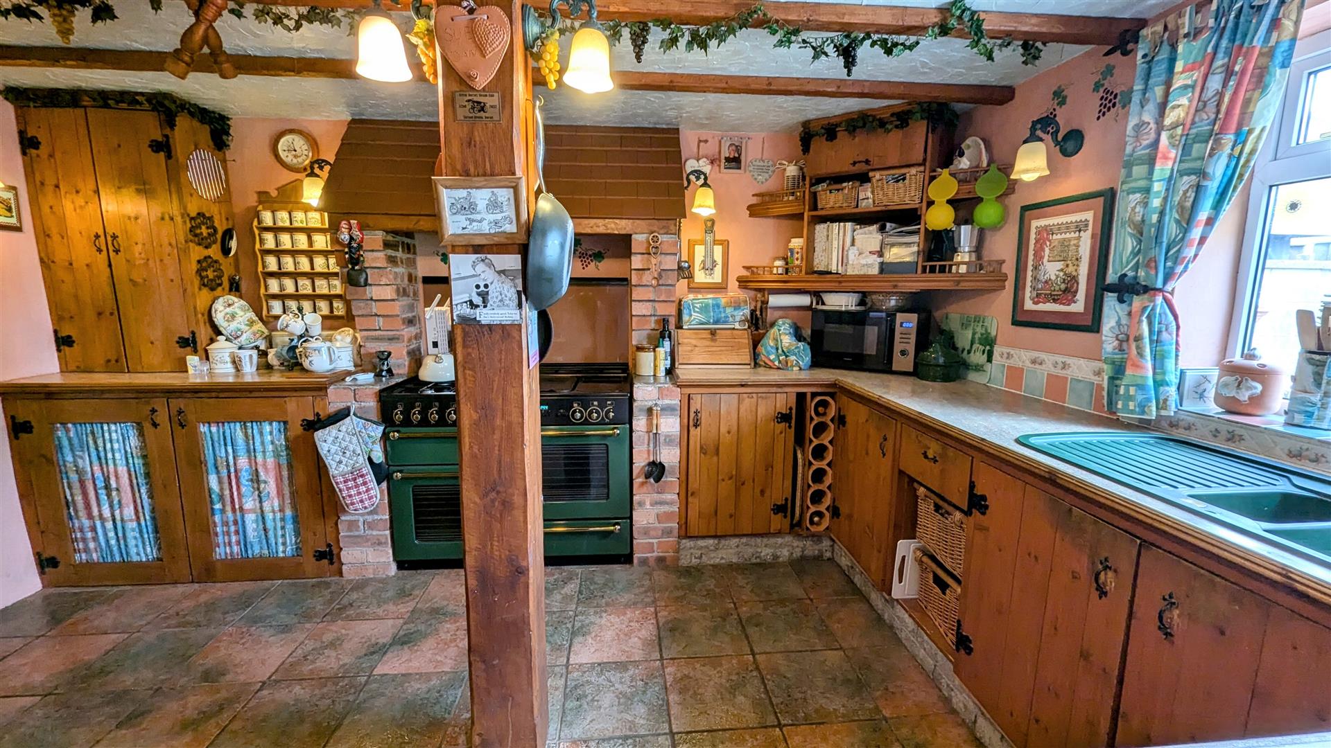Kitchen - 4.19m x 3.00m (13'09 x 9'10) - Extended 30 years ago, solid pine kitchen comprising of a range of base, wall and drawer mounted units, tiled flooring, part tiled walls, inset Rangemaster cooker with 5 rings incl. griddle plate, electric plate warmer, extractor fan to outside, one and a half bowl single drainer sink unit with mixer tap above, radiator, power points, appliance points, wall lighting, character beams, central wooden pillar, lots of storage throughout, rear aspect double glazed UPVC window, part glazed wooden folding door into: