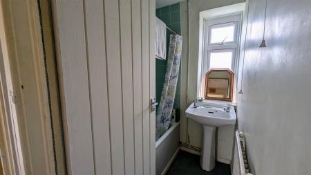 Bathroom - 1.45m x 1.60m (4'09 x 5'03) - Panelled bath with shower over, pedestal wash hand basin, radiator, rear aspect double glazed UPVC frosted window.