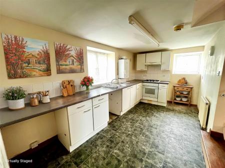 Kitchen - 4.45m x 2.51m (14'07 x 8'03) - Rear and side aspect upvc double glazed windows, range of wall, base and drawer mounted units, space for washing machine, space for tumble dryer, built in oven, built in four ring gas hob, extractor fan, space for fridge freezer, Worcester boiler, stainless steel single drainer sink and drainer unit with taps over, radiator, power points. Two steps up to: