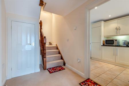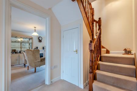 Entrance Hall - Radiator, power points, coving, understairs storage cupboard, thermostat for central heating system, stairs to first floor landing.