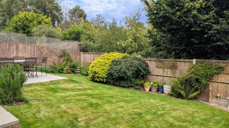 The garden itself is mostly laid to lawn, with a large patio seating area, mature shrub borders, all enclosed by fencing.
