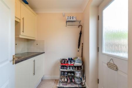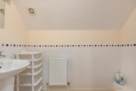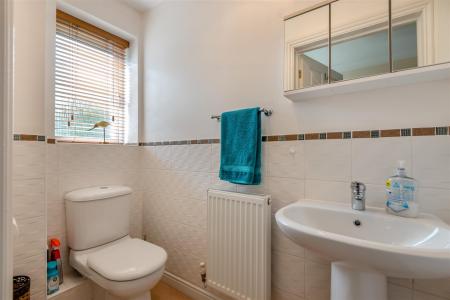 Cloakroom - W.C, vanity wash hand basin, radiator, part tiled walls, double glazed UPVC frosted window.