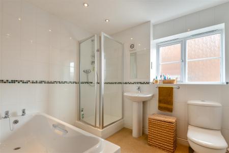 Bathroom - W.C, wash hand basin, bath, shower cubicle, tiled walls, wall mirror, extractor fan, heated towel rail, side aspect double glazed UPVC frosted window.