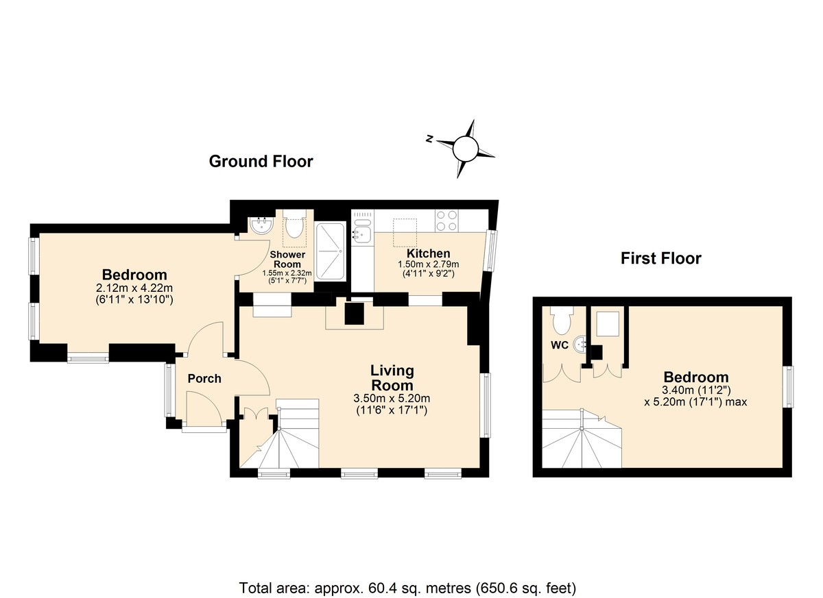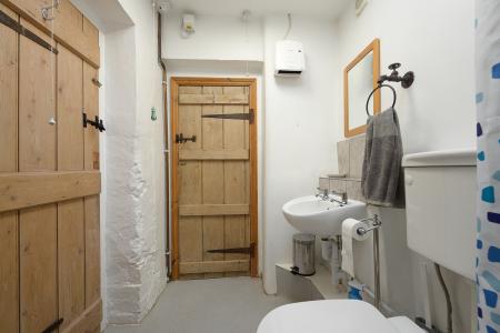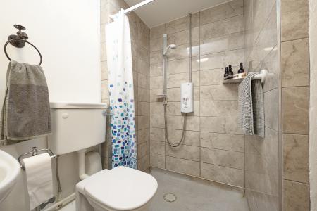 The ground floor also includes a double bedroom, accessed via the entrance lobby. The dual aspect room also enjoys access into a Jack-and-Jill wet room with a walk-in electric shower, a WC, and a wall-hung basin.
