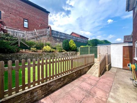 In the rear garden there is a patio area at the bottom with patio slabs, this leads up to a ramp which gives access up to the main part of the lawn which is a raised patio area and AstroTurf, flower boarder at the rear, all surrounded by fencing.