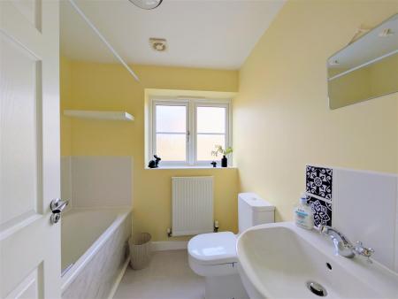 Bathroom - White suite comprising panelled bath with shower attachment over, close coupled W.C, pedestal wash hand basin with tiled splash backs, radiator, side aspect upvc double glazed frosted glass window.
