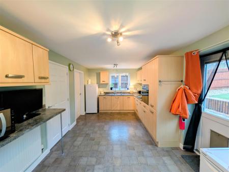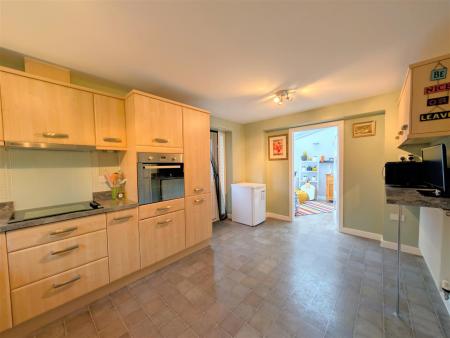 Kitchen - 4.62m x 3.02m (15'02 x 9'11) - Range of fitted wall, base and drawer units, worktop, one and a half bowl single drainer stainless steel sink unit with mixer tap over, built-in Hotpoint electric oven with four ring electric hob and cooker hood above, gas point also, integral dishwasher, space for two fridge freezers, power points, partly tiled walls, radiator, breakfast bar, side aspect upvc double glazed window, rear aspect double glazed door leading out to the garden. Door into: