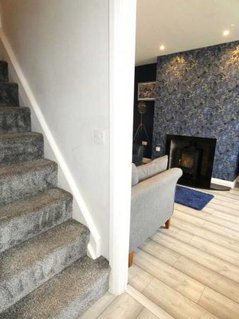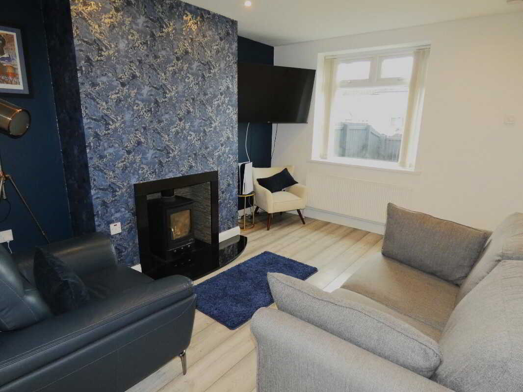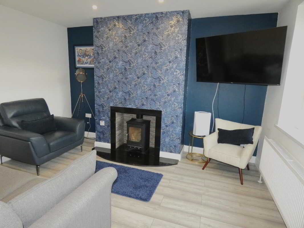 - Living room with a feature inset stove.