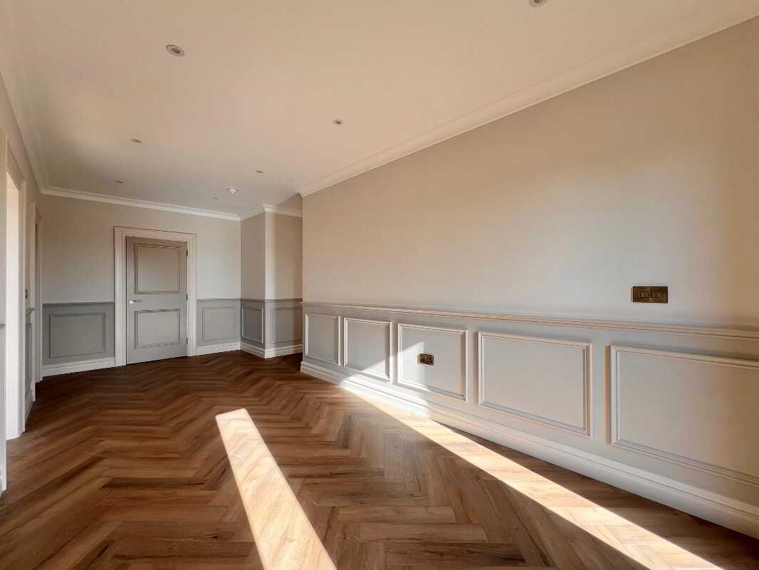 Solid wood two panel internal doors with detailed joinery to include hockey stick and deep skirting.