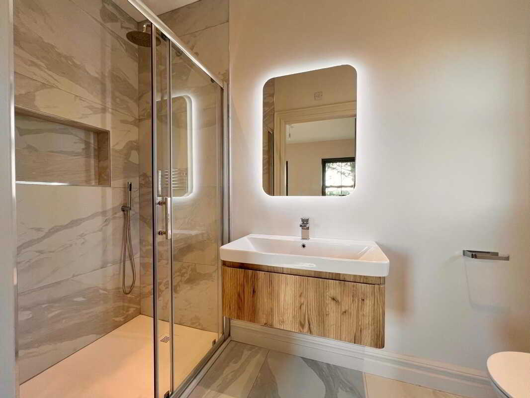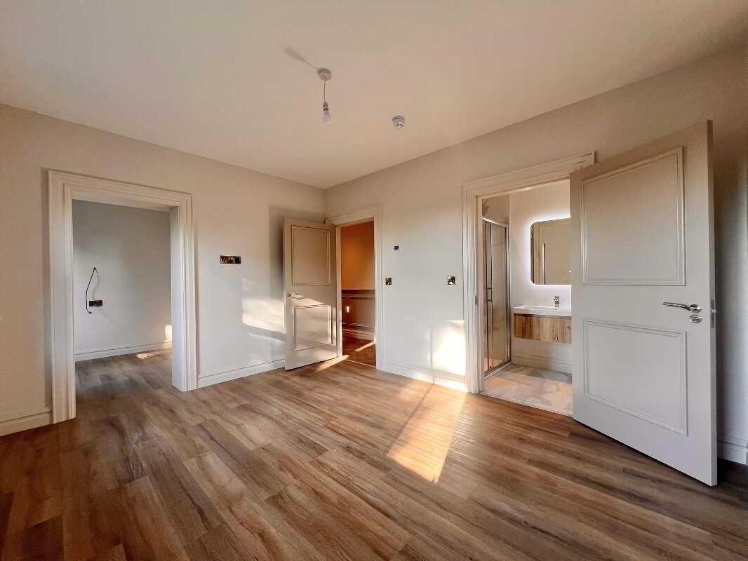 Ensuite with contemporary three piece white suite comprising of with wc, wall hung whb and vanity unit, illuminated mirror, power shower, recessed lights, floor fully tiled.Bedroom 2With laminate wood floor.Bedroom 3With laminate wood floor.Bedroom 4With laminate wood floor.Family BathroomContemporary four piece white suite comprising of wc, wall hung whb and vanity unit, illuminated mirror, freestanding bath, power shower with rainfall shower head, towel rail, recessed lights, walls part tiled, floor fully tiled.ExternalSpacious gardens to the front side and rear to be sown out in Spring.