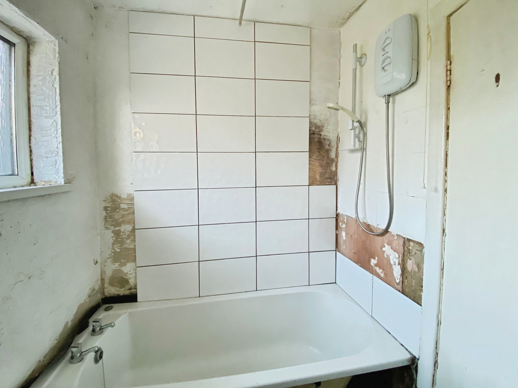 With WC, pedestal wash hand basin, electric shower over bath and part tiled walls.