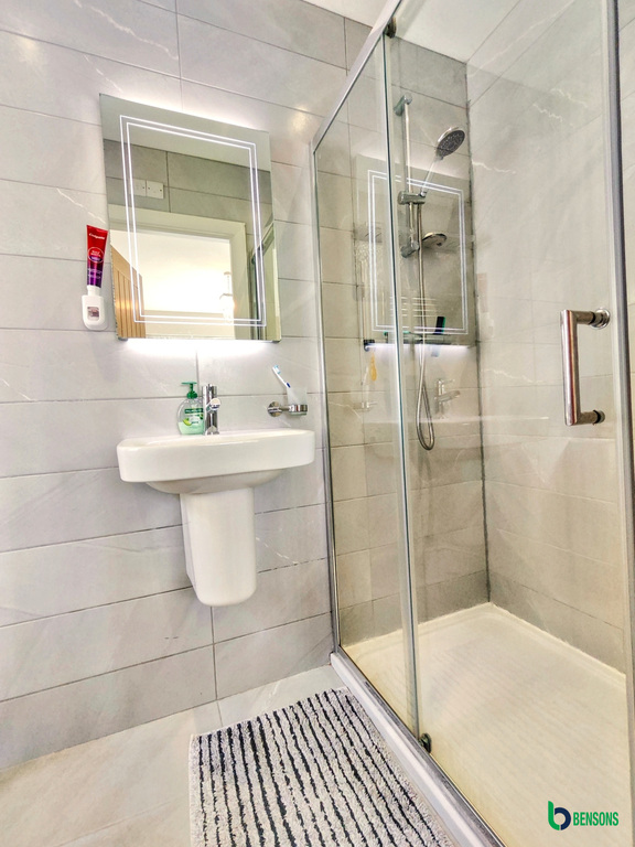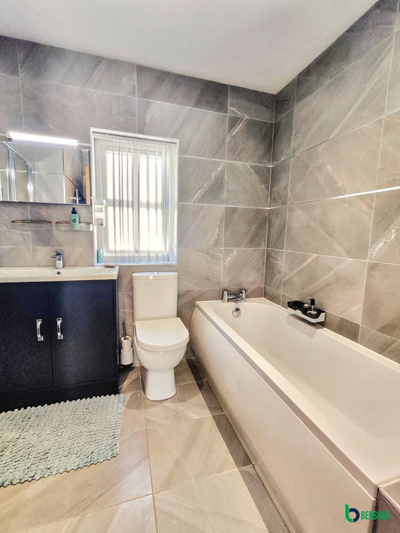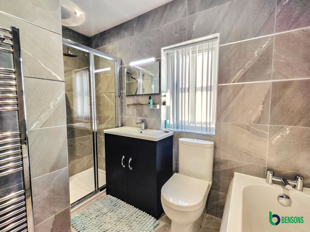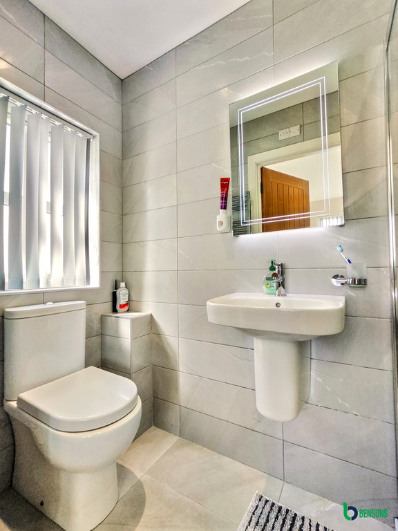 With WC, vanity unit with wash hand basin, bath, fully tiled walk-in mains shower cubicle with waterfall shower head, recessed lighting, extractor fan, fully tiled floor and walls.