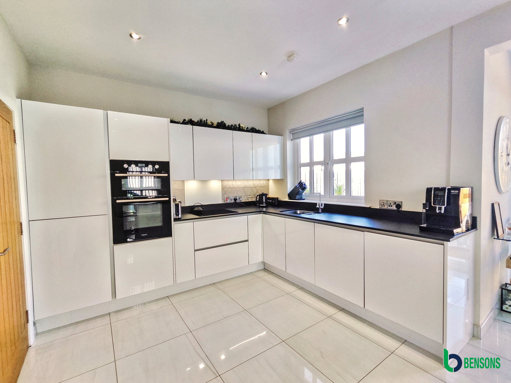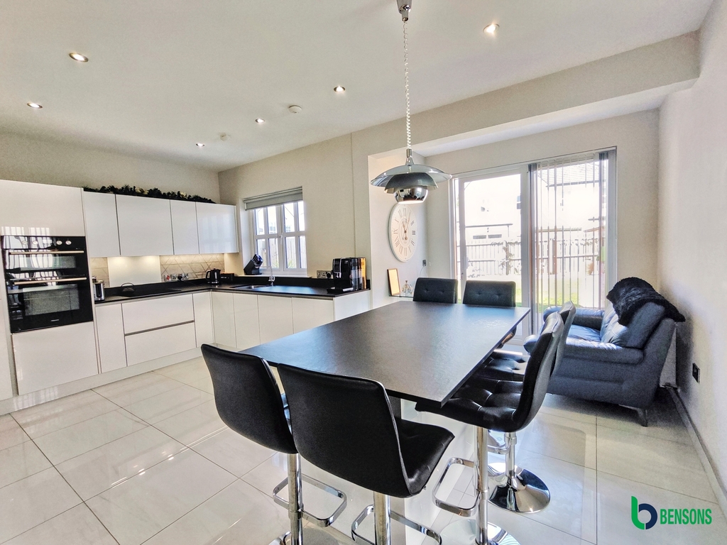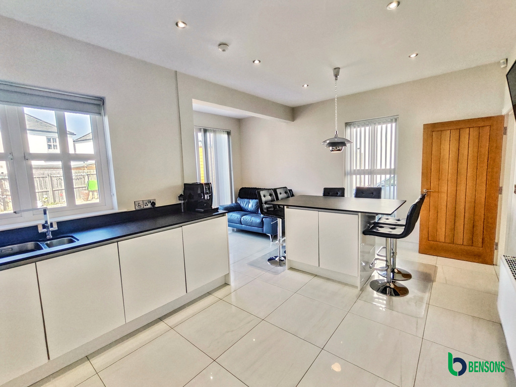 (Widest Point) With a range of eye & low level soft close units, "Franke"1/2 bowl stainless steel sink unit with mixer tap, "Dekton" heat proof worktops, concealed low level lighting, integrated "Hotpoint" double oven, integrated "Blanco" induction hob with extractor fan overhead, integrated "Indesit" dishwasher, integrated fridge freezer, Breakfast bar with "Dekton" heatproof worktop and built in storage, brush steel sockets and light coverings, recessed lighting, tiled floor and patio doors leading into garden.