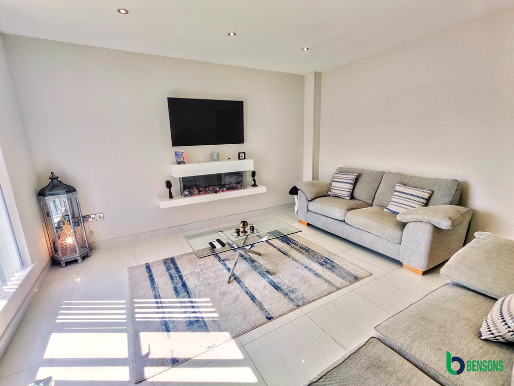 (Widest Point) With Electric fire inset, recessed lighting, brush steel sockets, tiled floor and tiled skirting with chrome trim.
