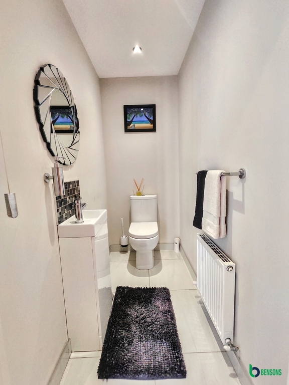 With tiled floor, tiled skirting with chrome trim. Cloakroom comprising of WC, wash hand basin with tiled splashback, recessed lighting, tiled floor and extractor fan.