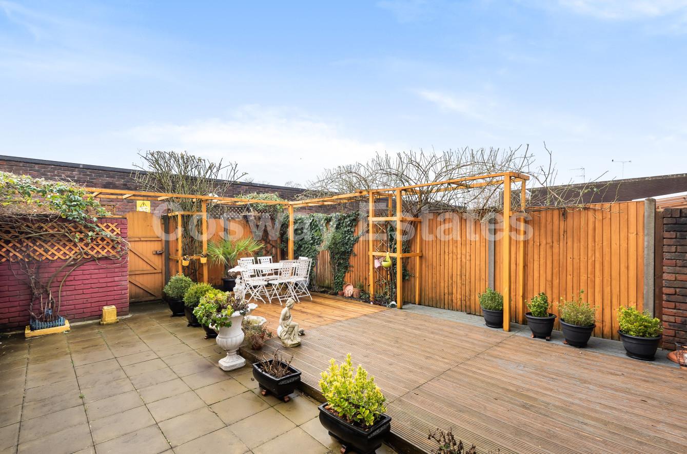 The property features a spacious living room/dining area with double doors to the garden, a generously sized eat-in kitchen and a lovely paved garden with decking.